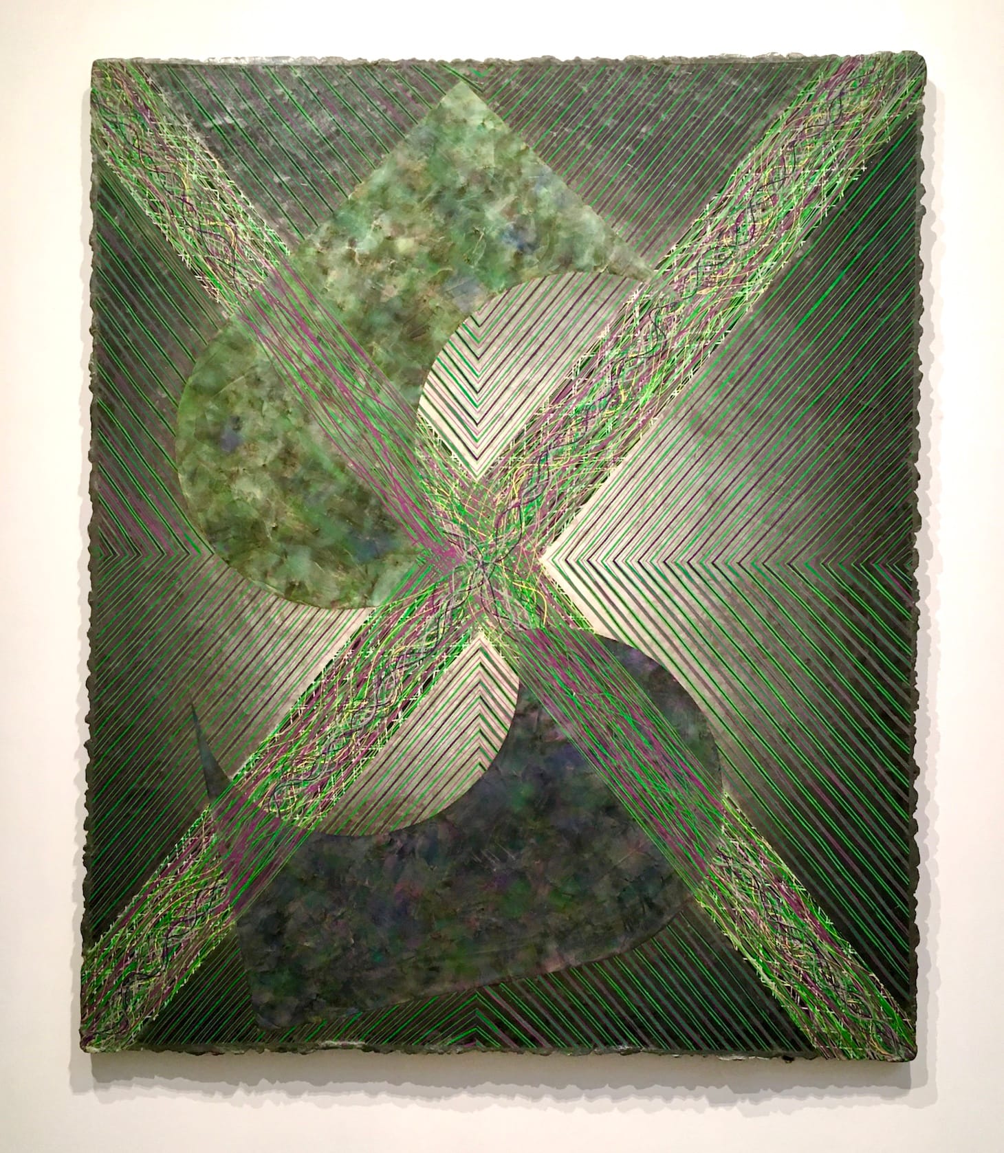 HJ Bott, "Damndazzled Generalizing Specificity" (2003), glazed vinyls and acrylic polymers on poly-flax, signed, titled, and dated on verso, 60 x 50 inches