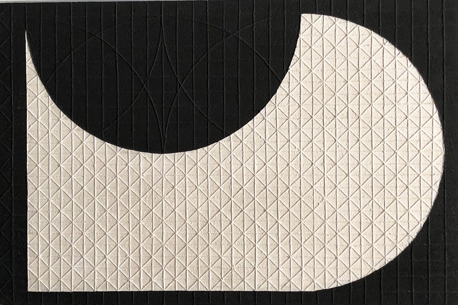 By working with the S shape within the rectangle, Bott developed what looks like a truncated sled, which can be made to interact in different ways with the other shapes and divisions. In “Nom De Plume (Gritch LXIII)” (1972), he uses polymers to adhere a flawless black and white skin to an etched pressed board, which is demarcated by a ridged grid of squares marked by X’s and vertical and horizontal lines, as well as larger circular ridges. The interplay between the white sled-like shape sitting within a black ground and the ridged surface of lines is mesmerizing because the physical surface and the painted form and black ground do not dominate; they maintain a contentious stalemate or embattled coexistence.