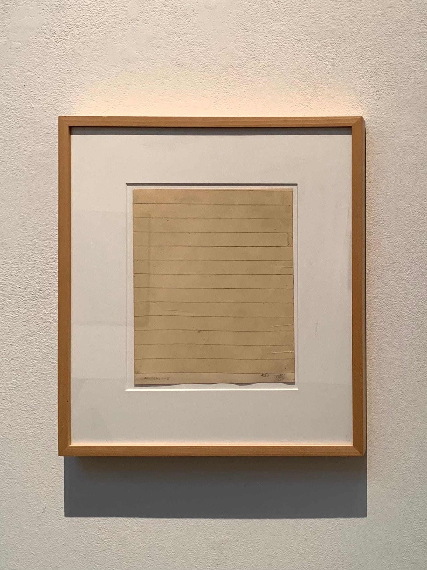 The artist belongs to the group of intrepid individuals that dissolves the barriers between art and science, conceptual systems, and alternative models of reality. In 1952, Bott (who was not yet 20) made a number of drawings in which he used different kinds of tape (masking, cellophane, and electrical), in tandem with graphite and charcoal, to divide the rectangular support into various configurations of stripes (vertical, horizontal, nesting right angles, and diagonals), which can be further differentiated by the use of black or gray. This smart, inventive series, in which the young artist incorporated tape, a found material, anticipates Frank Stella’s Black paintings. In “Scotchline” (1952), Bott used masking and cellophane tape, along with graphite, to horizontally bisect a piece of paper measuring 9 3/4 by 8 1/5 inches into a stack of modular bands. (Because of a three-year stint in the army, from September 1953 to August 1956, he did not pursue the implications of this and the other drawings in the series.)