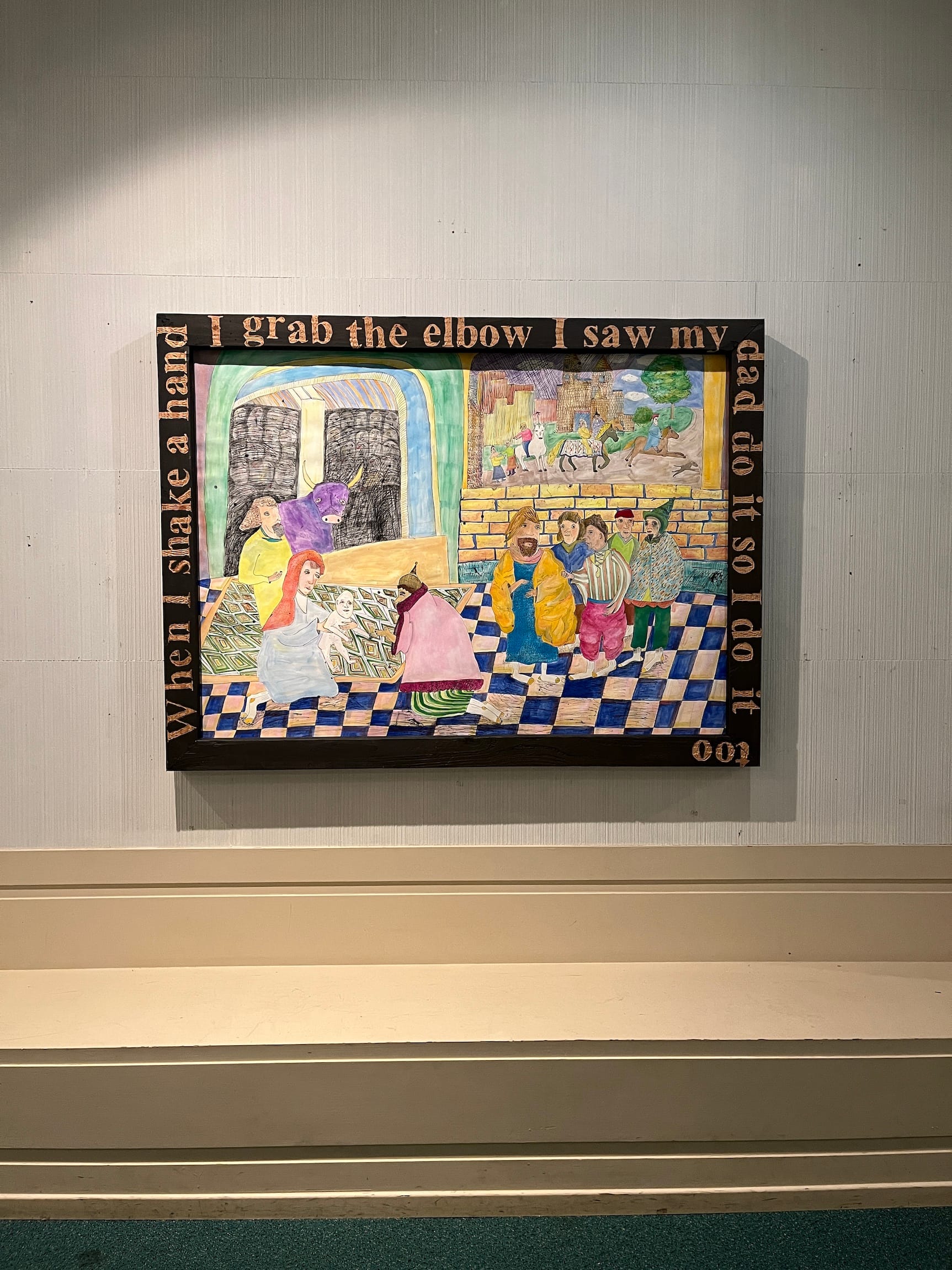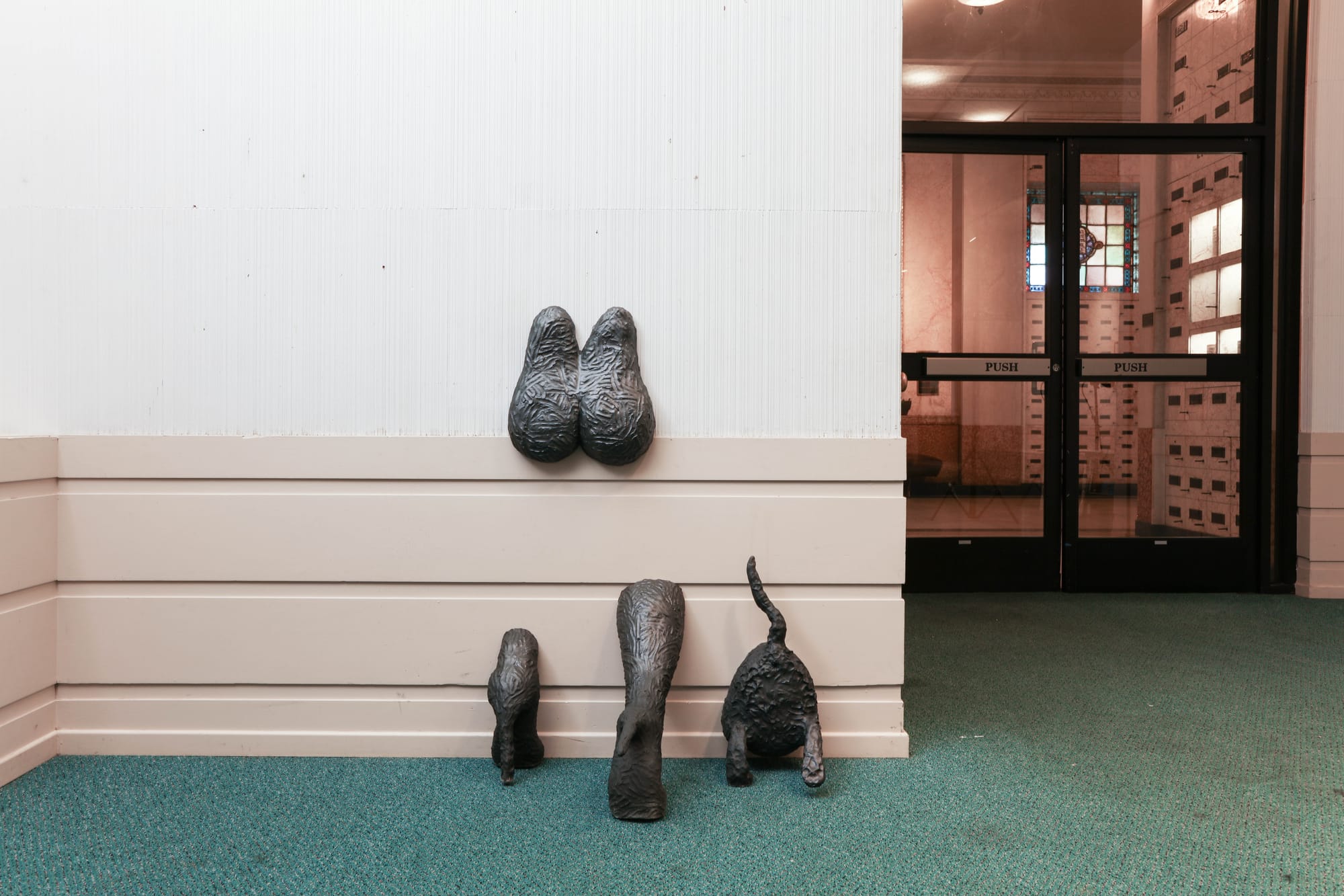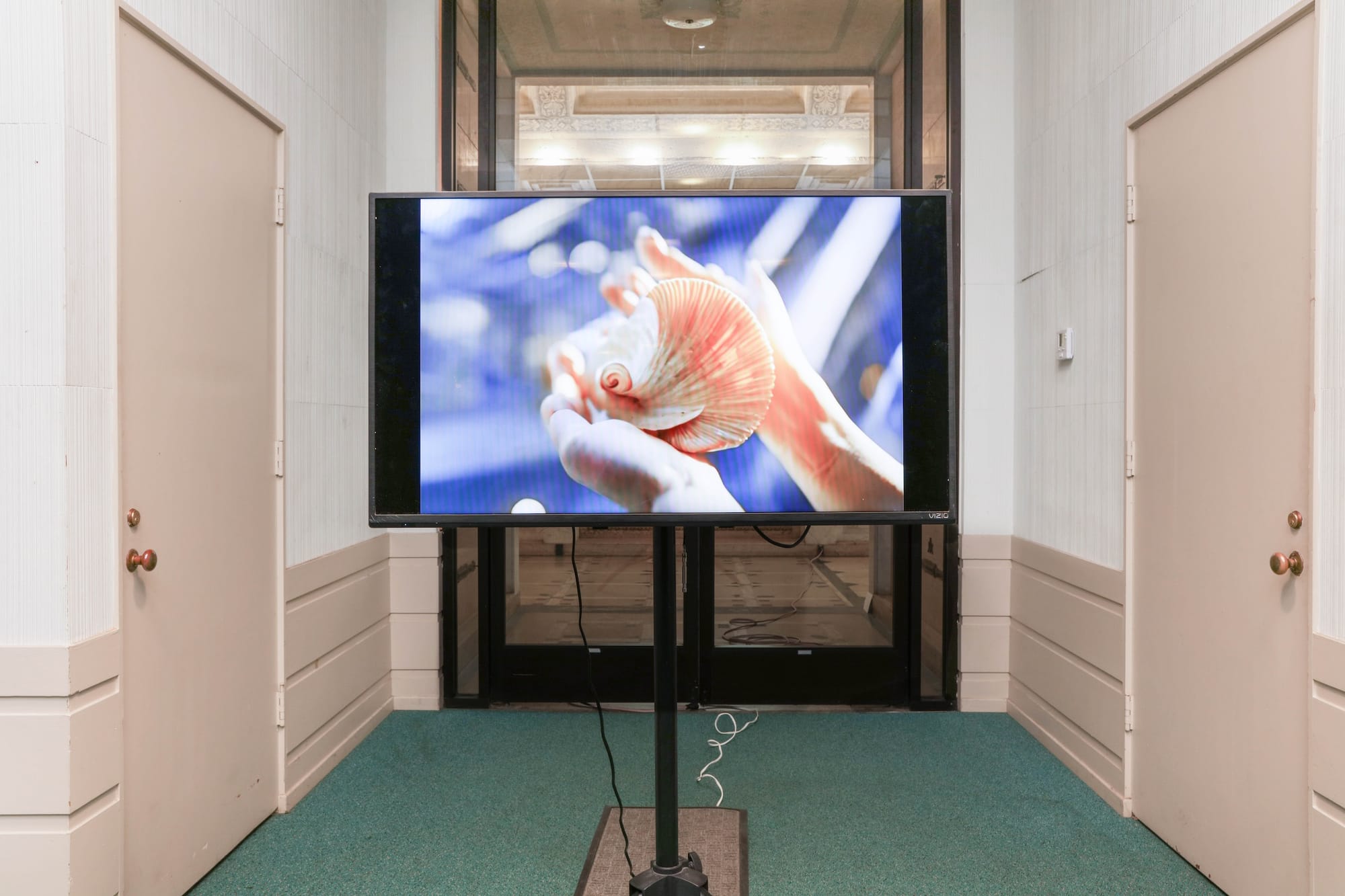 To get to the gallery, one must glide through a sprawling marble hallway of the cathedral-esque Mountain View Mausoleum, illuminated by sunlight pouring through ornate stained glass; up the stairs past "numerous crypts adorned with Christian iconography and Freemason symbols," as one artist put it. The room feels entombed in the mid-1980s, with stained jade green wall-to-wall carpeting and pale peach walls striated with texture and dust. An ajar closet door reveals the gallery's traditional landscape works now stacked against a rack of cleaning supplies, tissue boxes, and silk flowers. In each corner sit sculptures, and each recessed wall holds a painting. A video area in the back is set up to display memorial footage; it plays "Olga's Shell" (2023) by Anna Eisenman instead.