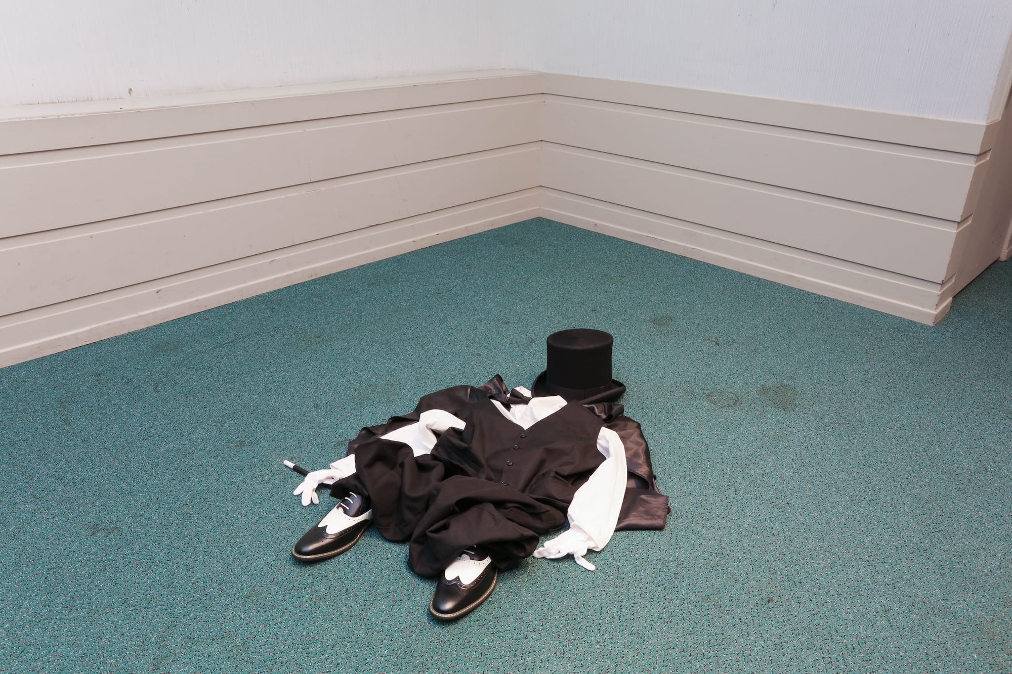 "Rapture" (2023) by Andy Bennett shows the rumpled costume of a classic magician — top hat, cape, bow tie, gloves, wand — all strewn across the floor as though they disappeared into thin air. The deflated magician has vanished, that is to say, "raptured" — a millennialist phrase pulled from the Book of Revelation in the Christian Bible and made popular in the 1990s by the actor Kirk Cameron and the Left Behind book series.