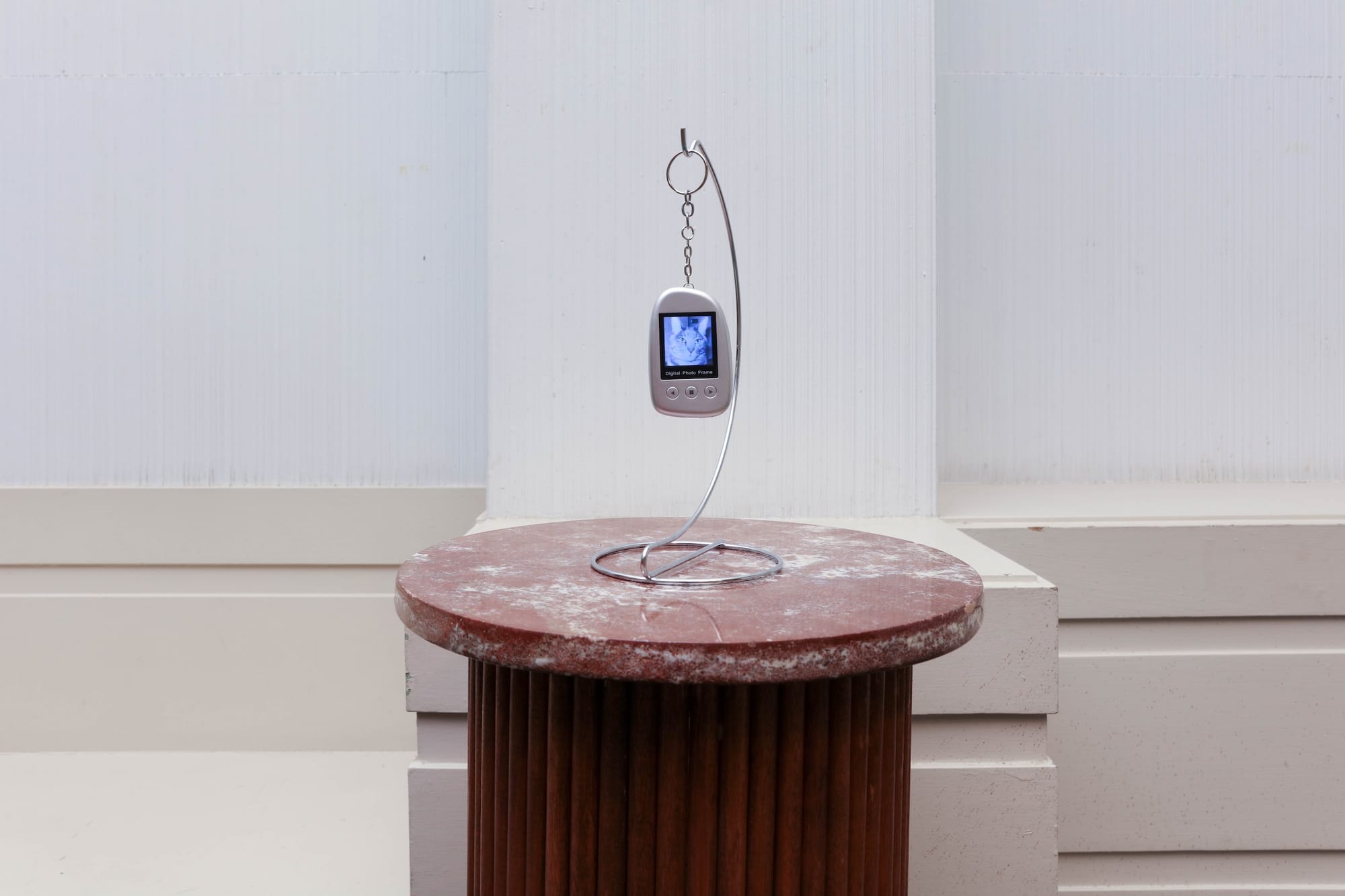Early-screen technology focused heavily on digitizing the classic photo album, making images last longer than human memory, if programmed correctly. Juliana Halpert's "Untitled #1" and "Untitled #2" featured an egg-shaped metal keychain with a photo screen that shuffled pixelated images of her two cats, dangling from a metal armature and installed onto a pedestal found in the gallery closet.