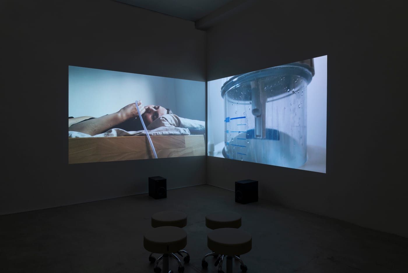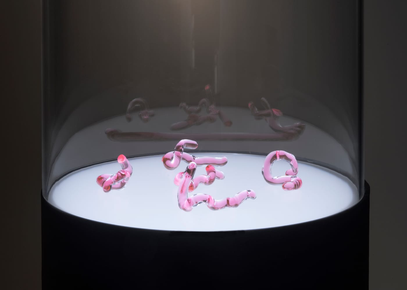 The central room contains Lovesick (2019), the second project, which consists of sculptures and photographs. The sculptures, ten small vials of hand-blown pink glass, are on two circular stands, one white as snow, one luminously blue. The individual vials look like unnaturally thick earthworms, except that some are rearing like snakes about to strike. They represent 10 different energy states of the oxytocin molecule and were produced using molecular modeling software.