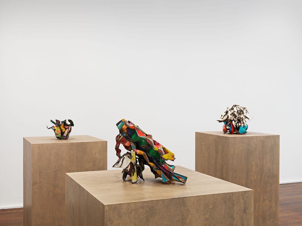 They are all beautiful, often too beautiful — sleek and sensuous and sure-footed — and in this way they call to mind the baroque metal reliefs that Frank Stella began in the mid-1980s, a few years before the first of the Tycoons. But the best of Stella’s work from that period revels in a quantum of insanity, of too-muchness, of the artist losing control of the process. Chamberlain’s pieces, by contrast, keep their elbows and knees tucked in, sitting tastefully in the center of their plinths.