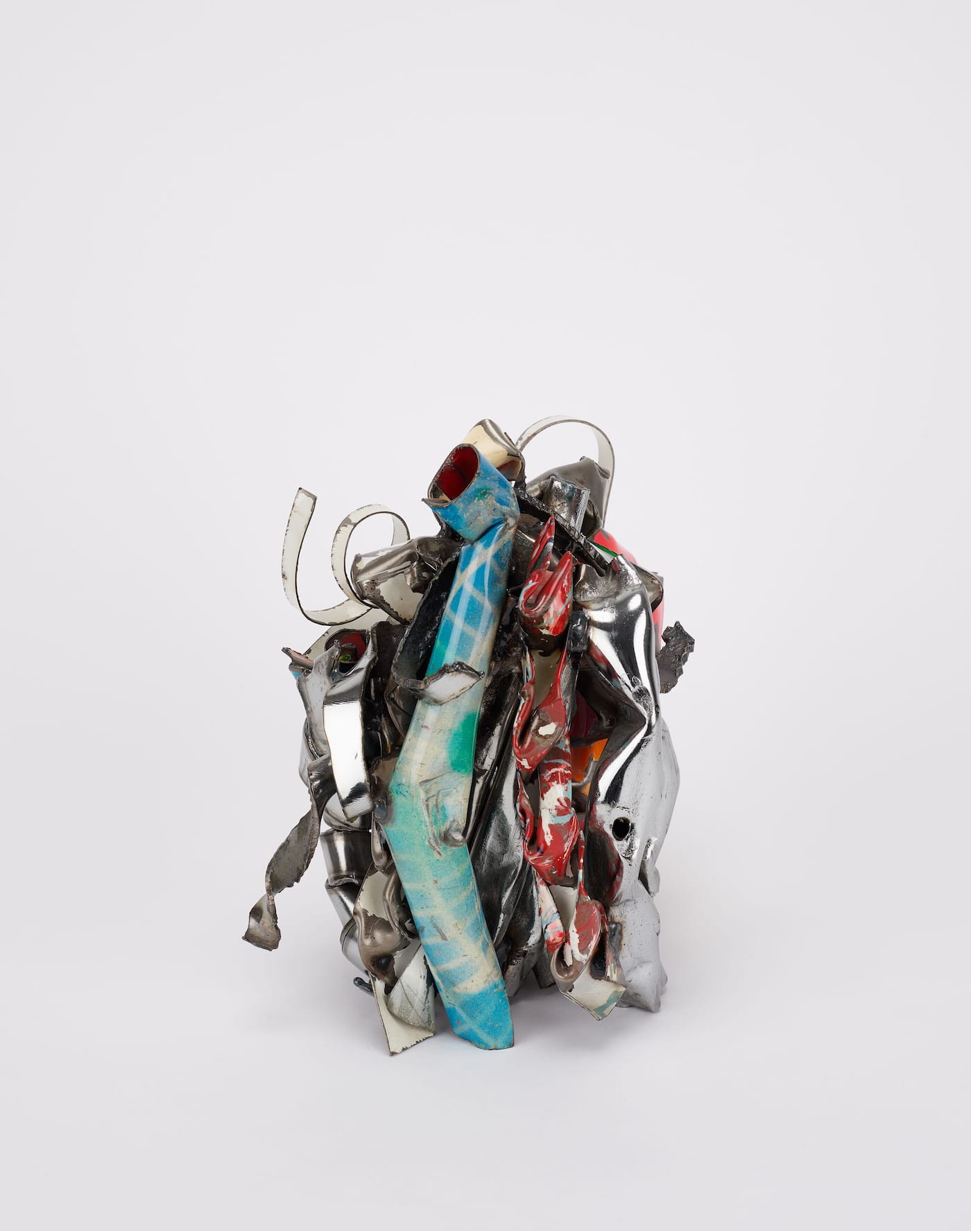 By the time he started the Baby Tycoons, Chamberlain had packed in more than a half-century of exploring forms, materials, and techniques, and it shows. His process is assured, his touch consistent. The bent, clustered, and twisted forms, painted in bright, contrasting colors, are blossom-like miniatures of the heavy metal sculptures that put him on the map.