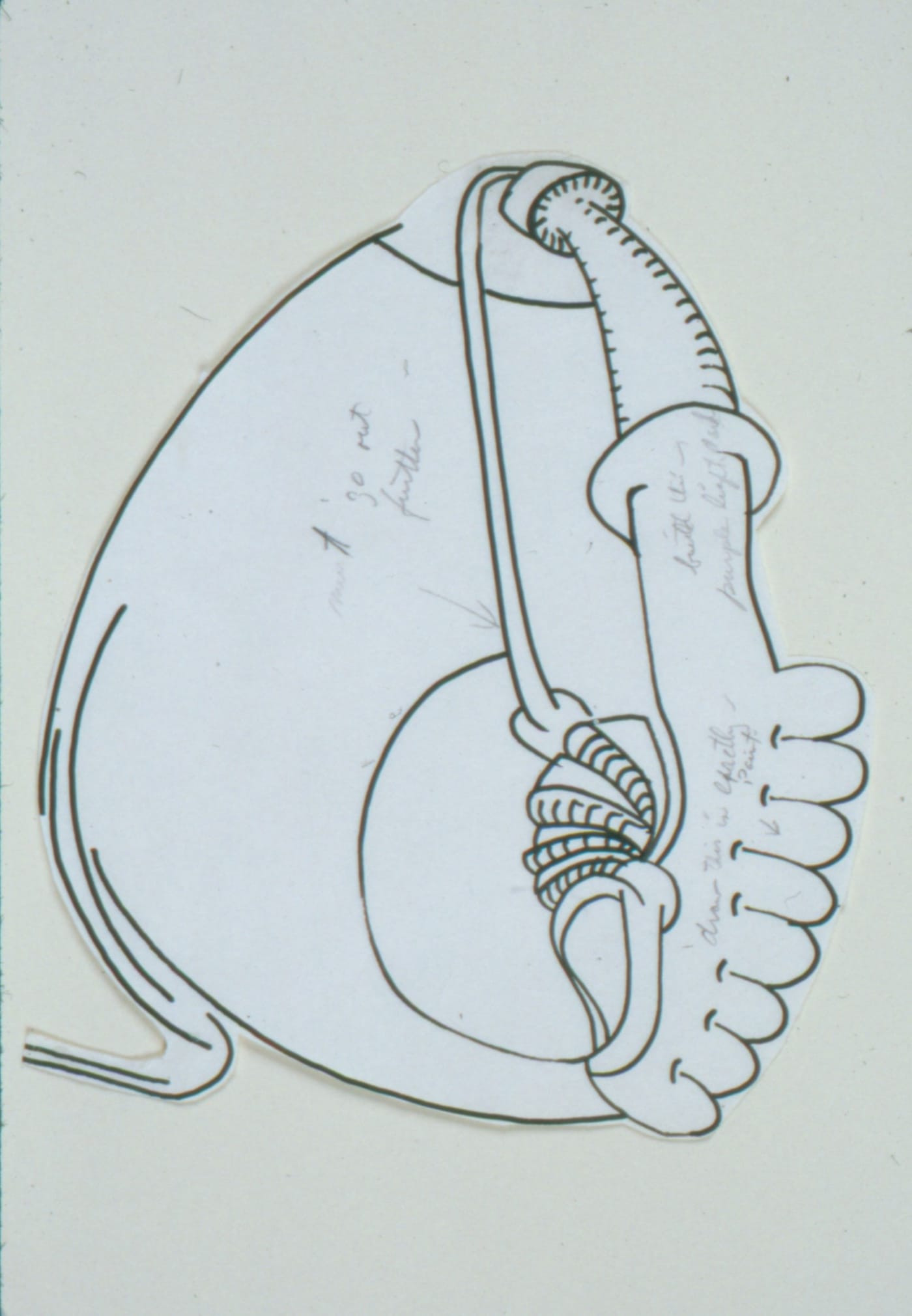 Even more striking are the framed sets of shaped, cutout ink-and-graphite drawings from 1965 that are simultaneously studies for sculptures, standalone graphic forms, and objects in themselves. They resemble pneumatic apparatuses at once erotic and lethal, suspended between surrealism and science fiction, drawn with a loopy hand that balances the rigorously volumetric with the flamboyantly cartoonish.