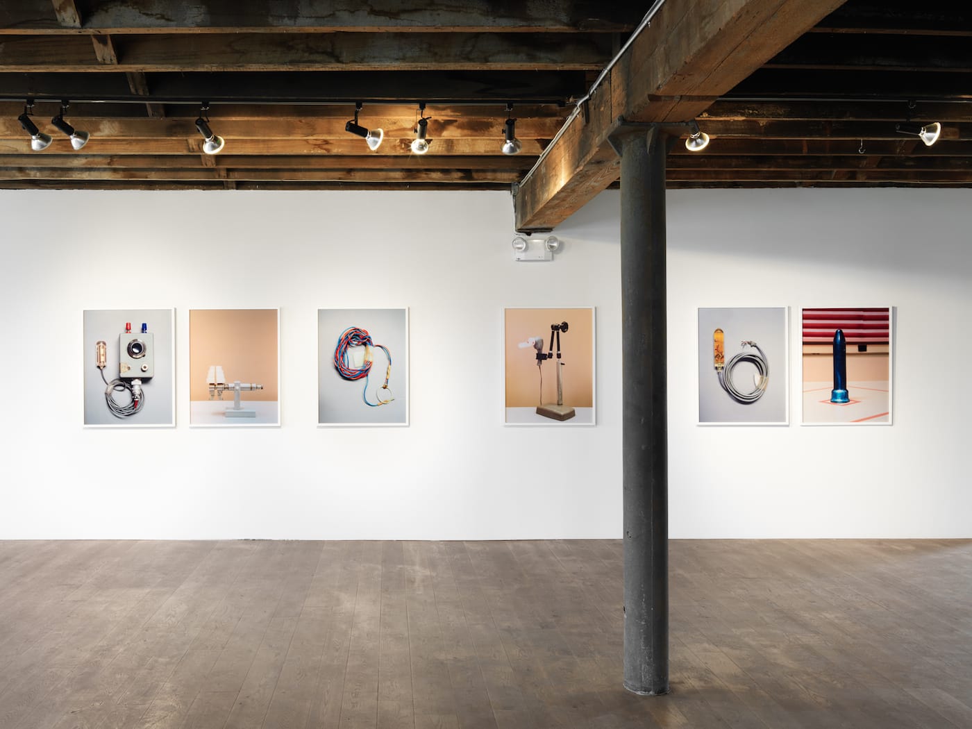 Selections from this series line two of Pioneer Work’s three gallery walls. Half of Sudhoff’s photographs show devices on a flat surface, the camera directly above them, as though the viewer is looking down to grab or clean them. The other devices are captured in full or three-quarter portraits, as though one is walking up to them. The photographs alternate, and as you scan them you toggle between the role of researcher hovering over the device and the participant. The experience of imagining oneself as both, so rapidly, is unsettling in its intimacy.