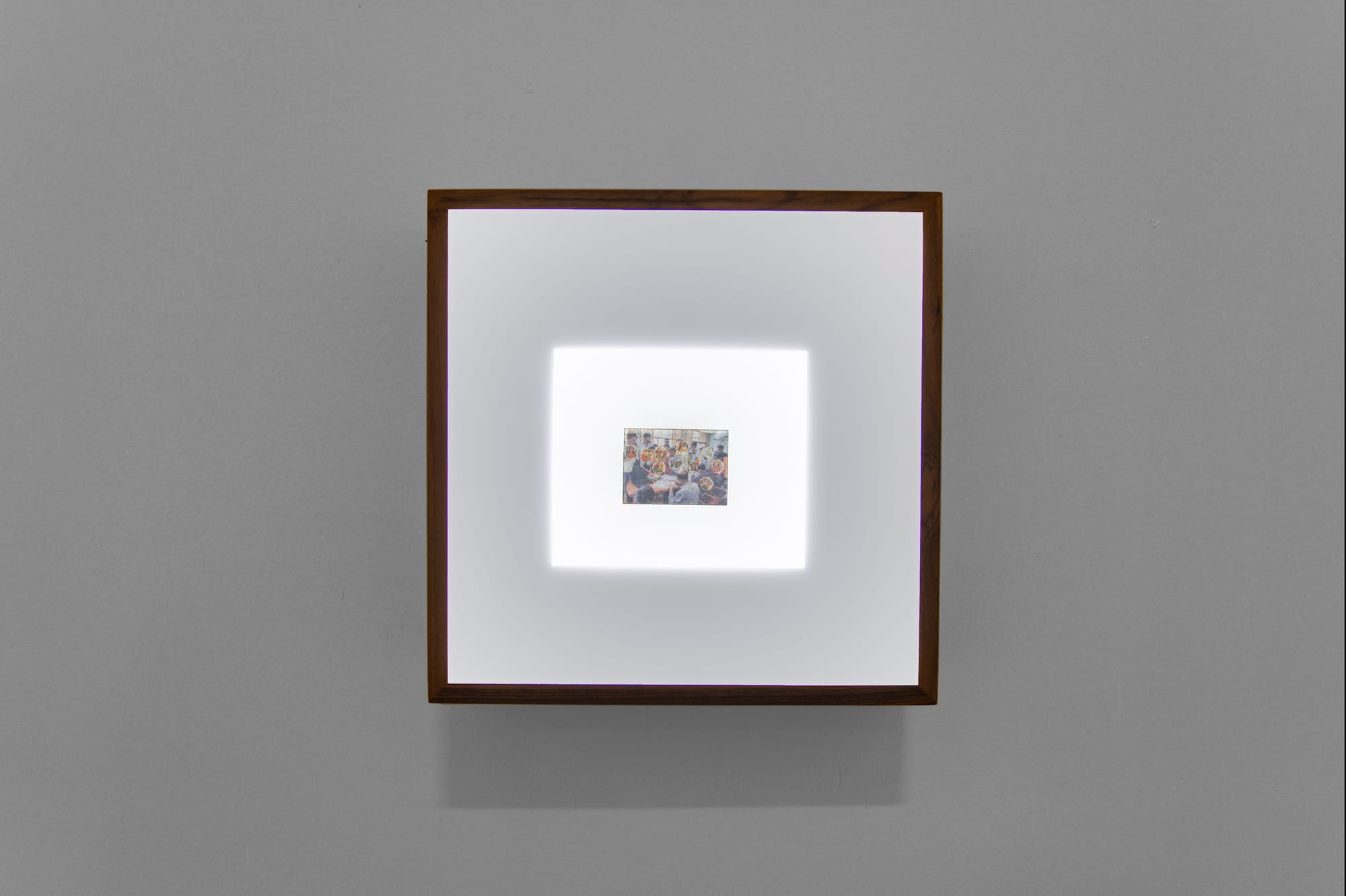 Ten of the light boxes are evenly spaced on a long wall of an enclosed, hall-like area. The single light box at the far end, which I encountered last, contextualized what I had been looking at: circular enlargements of spiky fabric, sometimes against a black shape suggesting an arm or shoulder, on a white ground. The last light box contained a key to the installation, a grainy colored photograph of a group of men standing in front of a table at which two men sit and look over a stack of papers. Dispersed across the picture are circles in which the artist has inserted an indecipherable, but seemingly figurative, image; it is the blowups of these circles that we see in the other 10 light boxes.