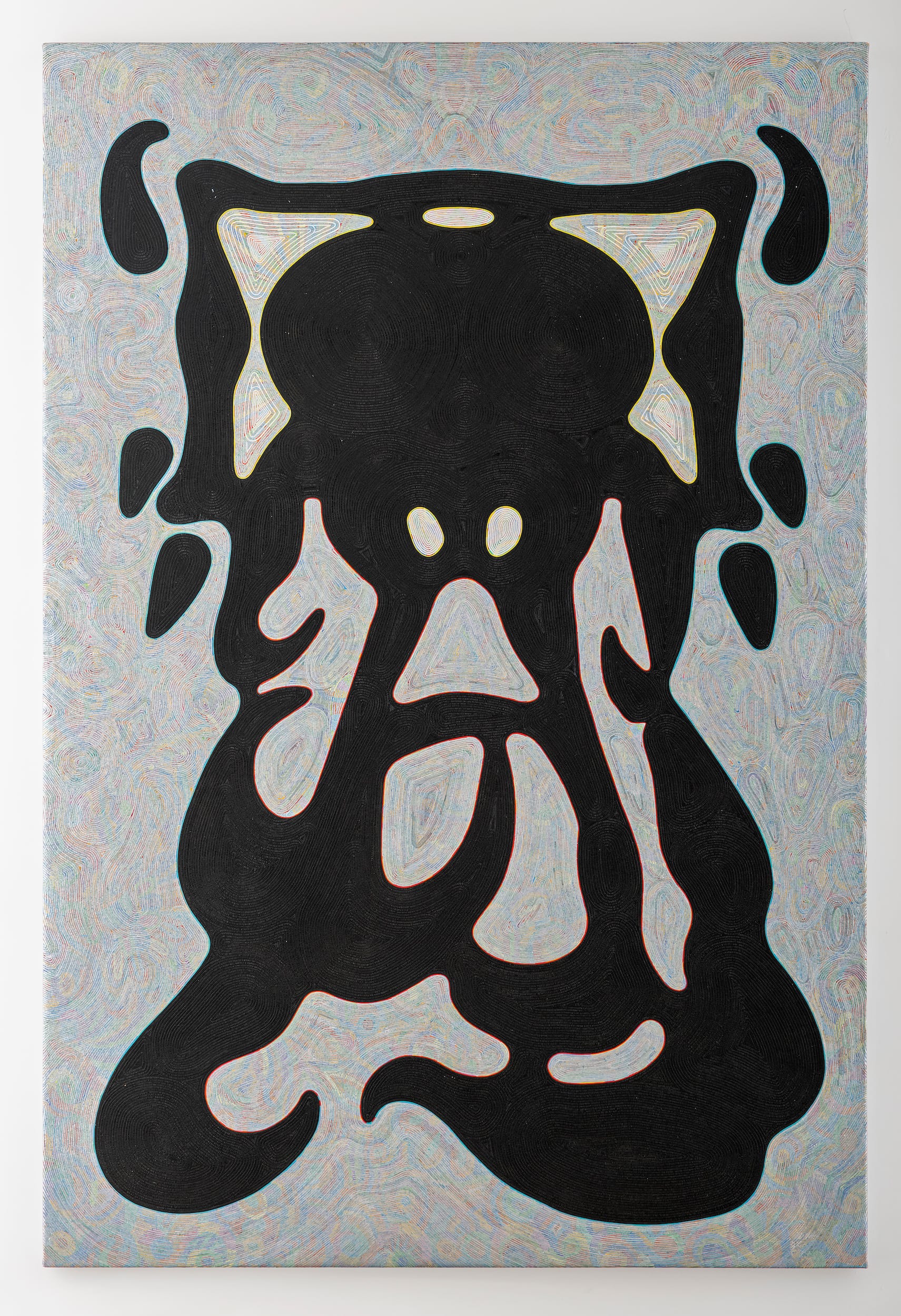 The exhibition’s paintings, created by layering varied materials (listed as “acrylic colors, silver gift wrapping paper, tar paint, and UV varnish on canvas”), are rendered as different patterns of acrylic color carefully applied in parallel and nesting bands overlaid with open networks of linear filigree. The bands’ different-colored sections recall pinched oval beads. Superimposed over this is a Rorschach-like silhouette composed of echoing and nesting bands.