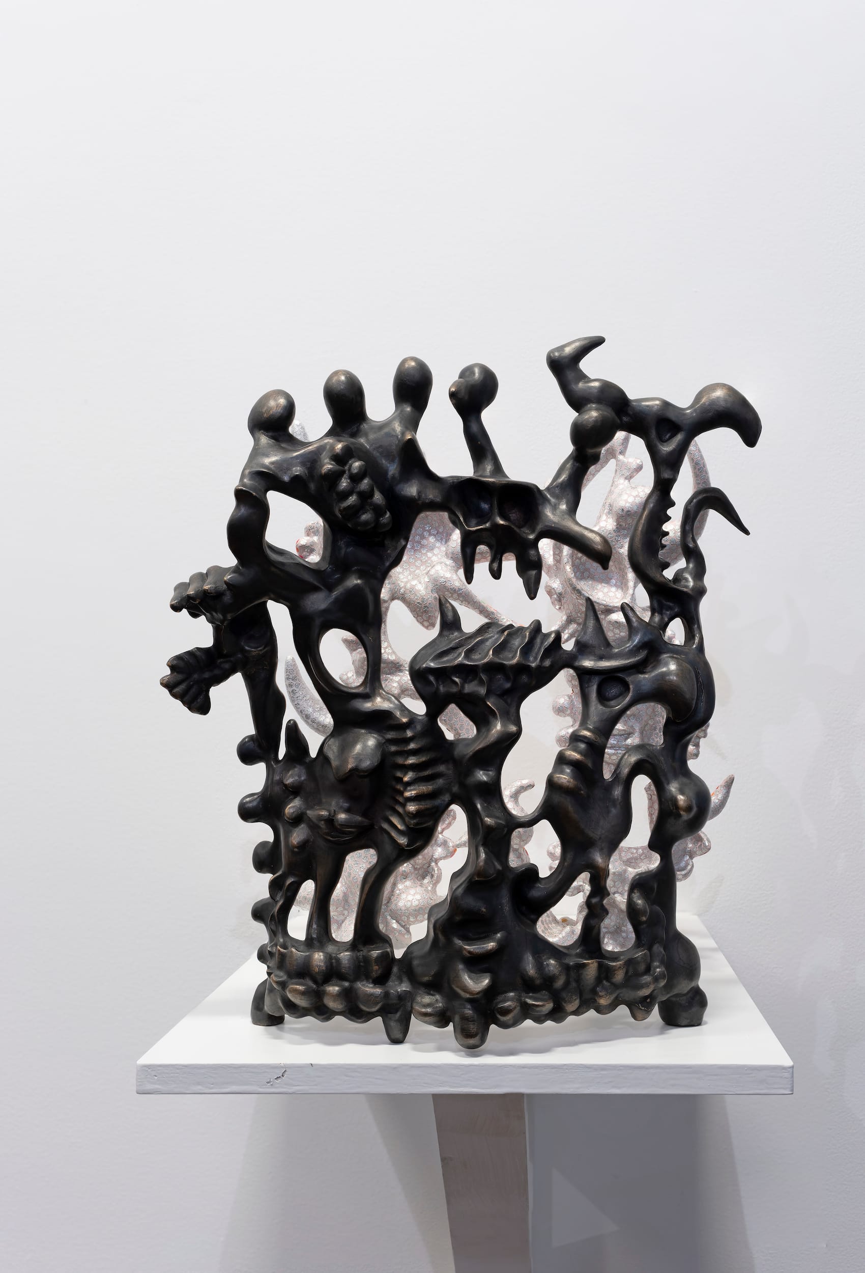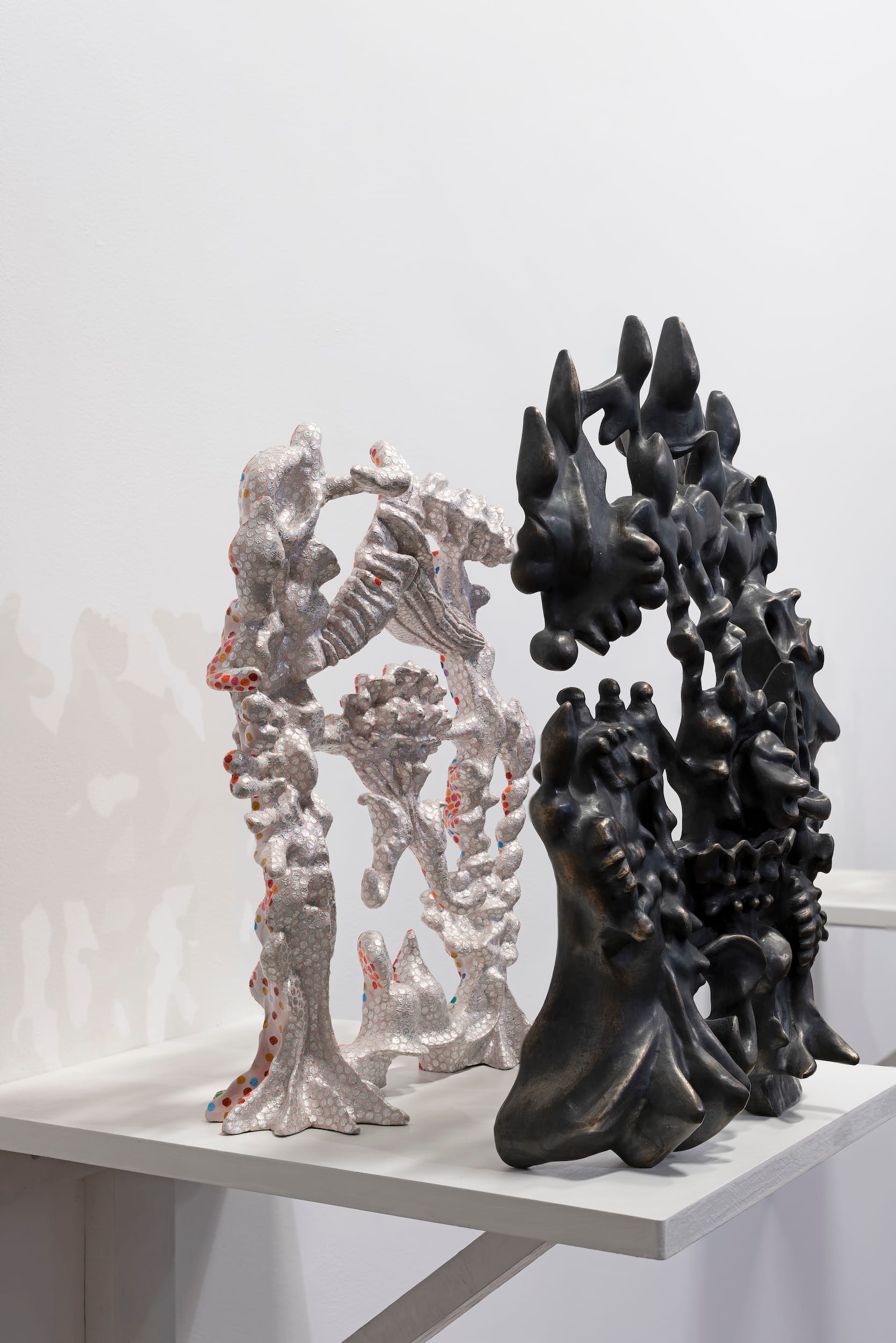 The three sculptures, composed of a dark and a light-colored part, each made of distinct materials (sand-blasted bronze and fiberglass; colored paper and silver wrapping paper) are each titled "Missing – Flowers of the Wilderness" (all dated 2023). Both parts are open forms with uneven surfaces marked by bulbous and tear-like shapes, recalling spiky coral. The bright fiberglass pieces peer through the openings of the blackish bronzes. While the title indicates that the source is from nature, the press release clues the viewer into Joshi’s source.