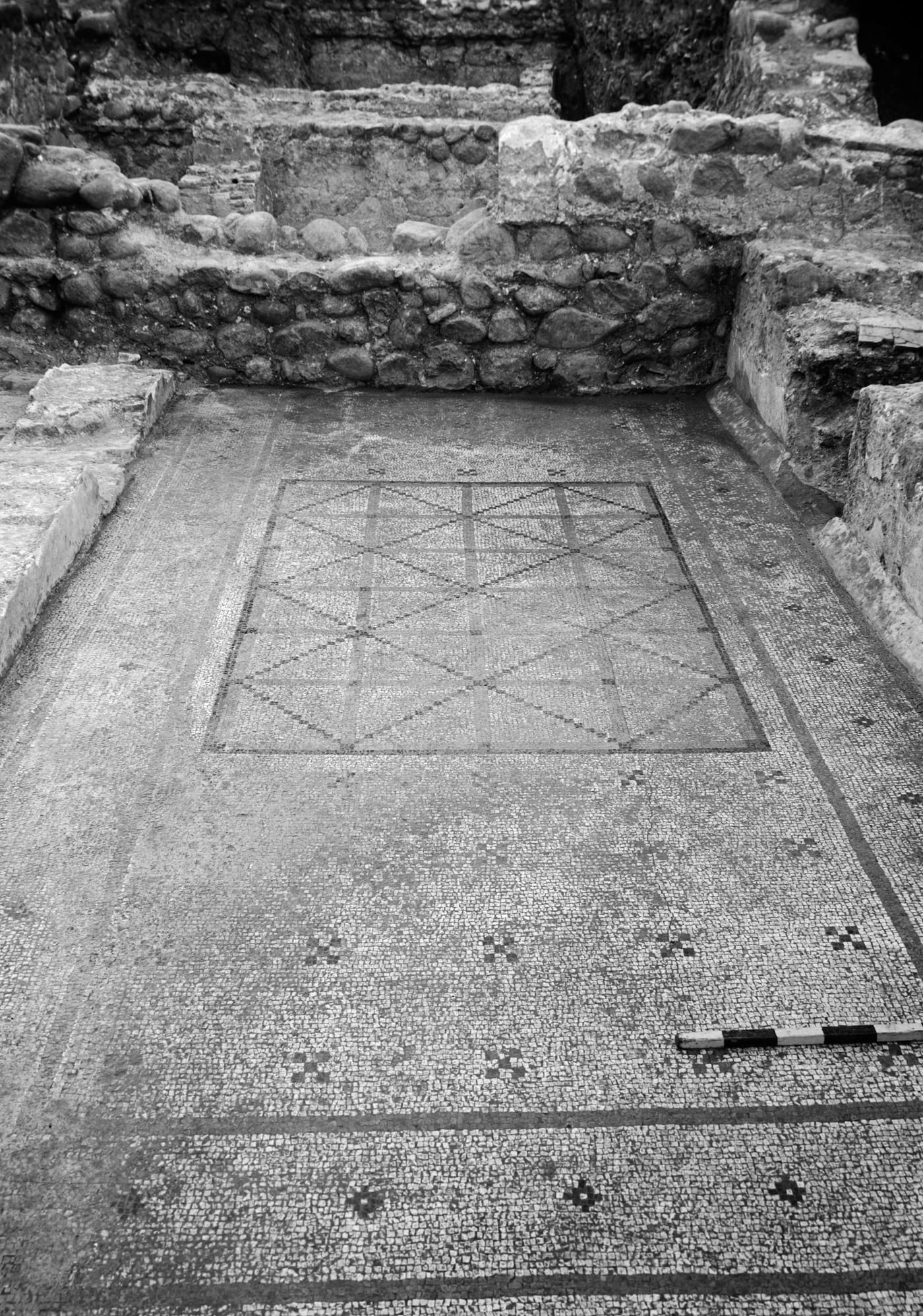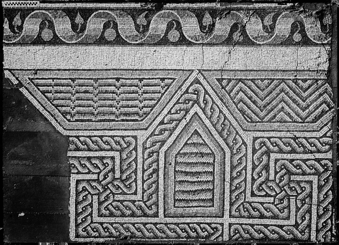 Each was once installed as attractive flooring in five different villas, which had very distinct names such as the “House of the Drinking Contest” and “House of the Evil Eye.” Archaeologists with Princeton University had excavated them in the 1930s; MFA purchased the group in 1964, as one of its very first acquisitions. All five date between 100–300 CE and are made of limestone and marble tesserae. Decorating their surfaces are, for the most part, various intricate, geometric patterns, although one mosaic includes a partially preserved human figure and a portion of an inscription.