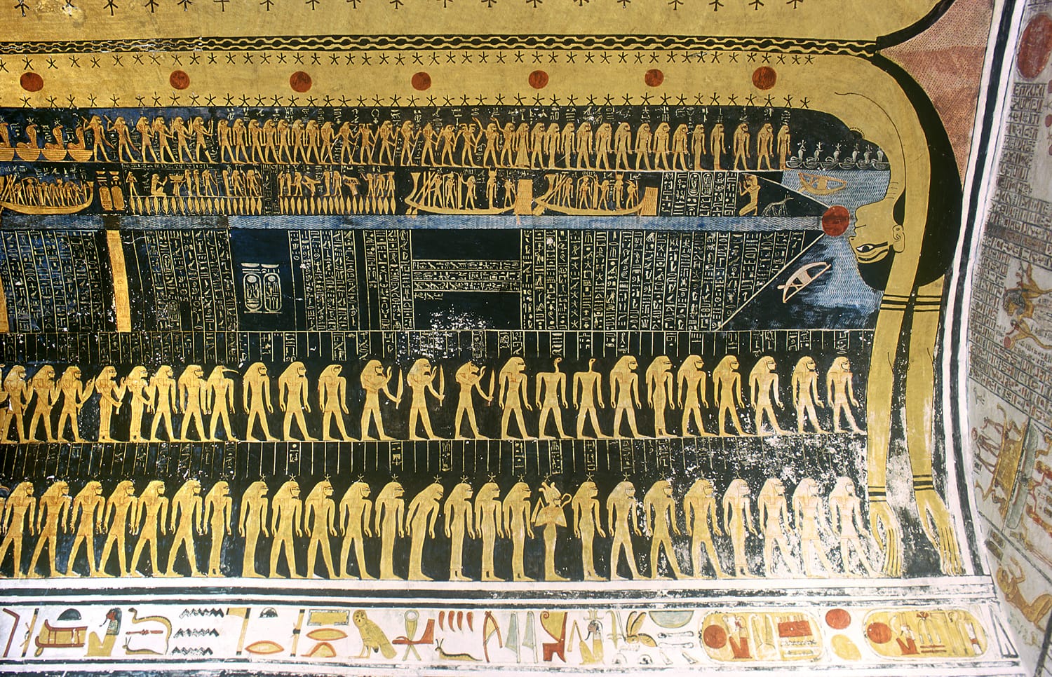 Or Graur, associate professor of Astrophysics at the University of Portsmouth’s Institute of Cosmology and Gravitation, analyzed a catalog of 555 decorative coffin elements, including 118 that featured “cosmological vignettes” from the 21st and 22nd Dynasties. The literal starring character in these vignettes is the Ancient Egyptian sky goddess Nut (nwt), often depicted as a huge figure arching in a semi-circle above the tableau, representing the sky, studded with stars.