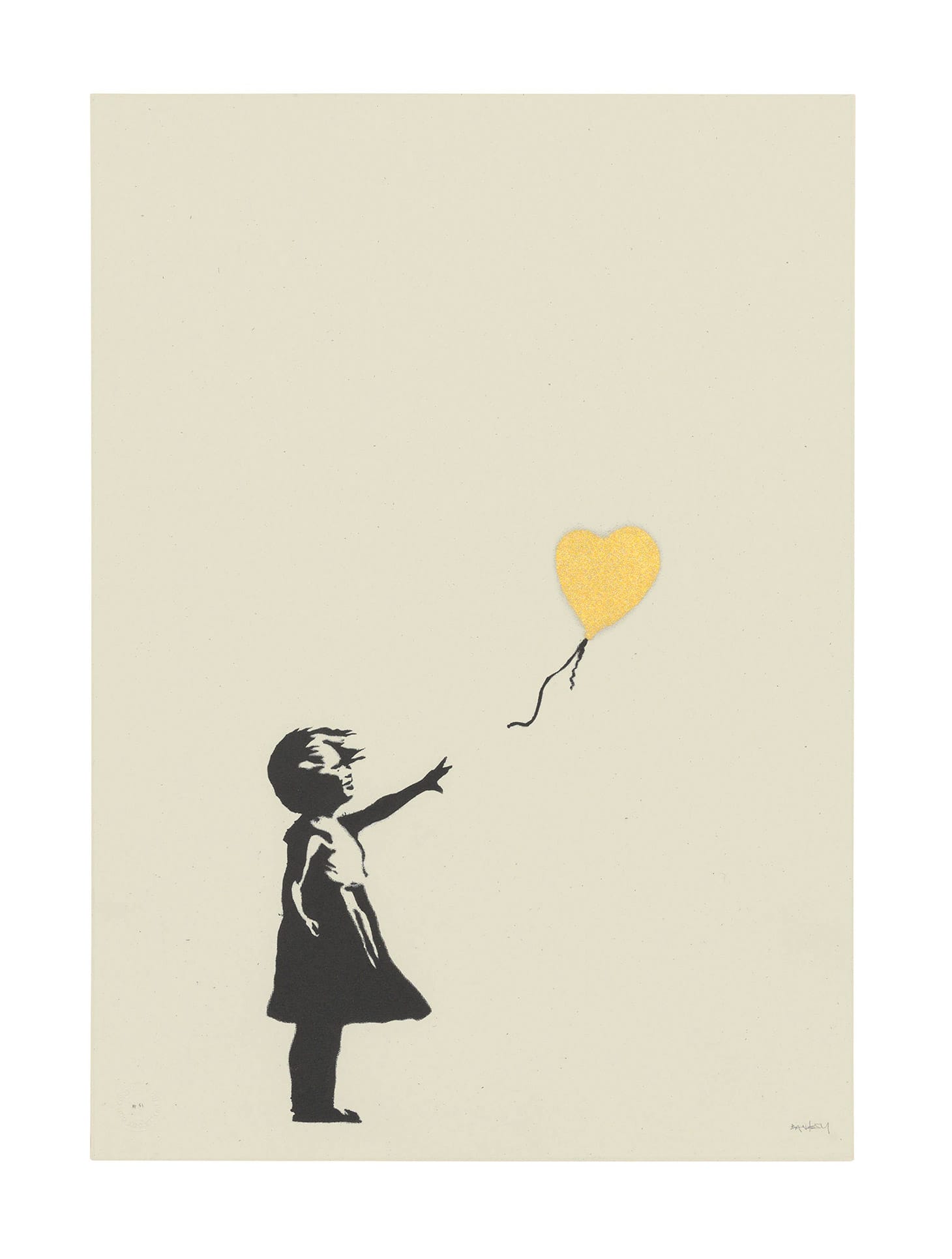 The Christie’s online Banksy sale, subtitled “I can’t believe you morons actually buy this sh*t,” reached a final receipt of £1,122,750 (~$1,383,452) for a range of work across the enigmatic artist’s career. The top lot of the bunch was “Girl with Balloon – Colour AP (Gold),” which sold for £395,250 (~$487,027).