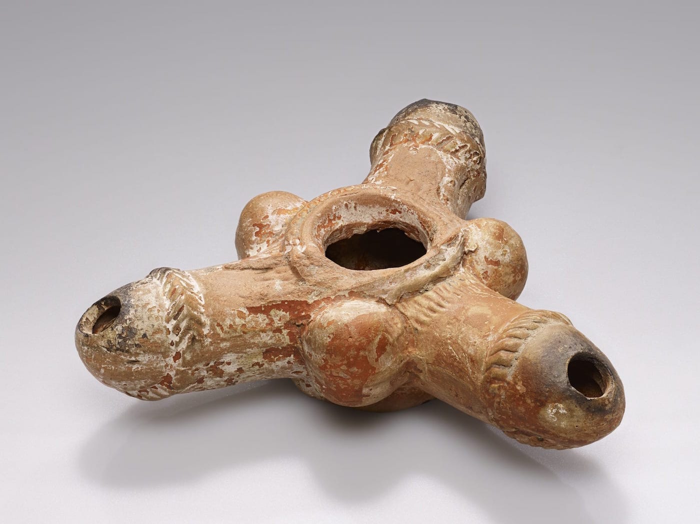 Early clay lamps were wheelmade and resemble pigs’ ears, shaped like a saucer with a pinched corner for a wick-rest. But once artisans began working with molds — a faster technique that also allowed for mass production — they could introduce all kinds of figurative elements and ornate decorations. It was during the Hellenistic period when lamps began to be more than common domestic artifacts and took on increasingly creative exteriors. Their shapes, too, changed. Some look like bulbous teapots or jugs; some feature extravagant handles that resemble people. And then there are the lamps that look nothing like lamps. One that’s shaped like a seated man reading a book scroll seems more pipe-like; another that features three connected phalluses looks oddly like an ancient precursor to the fidget spinner.