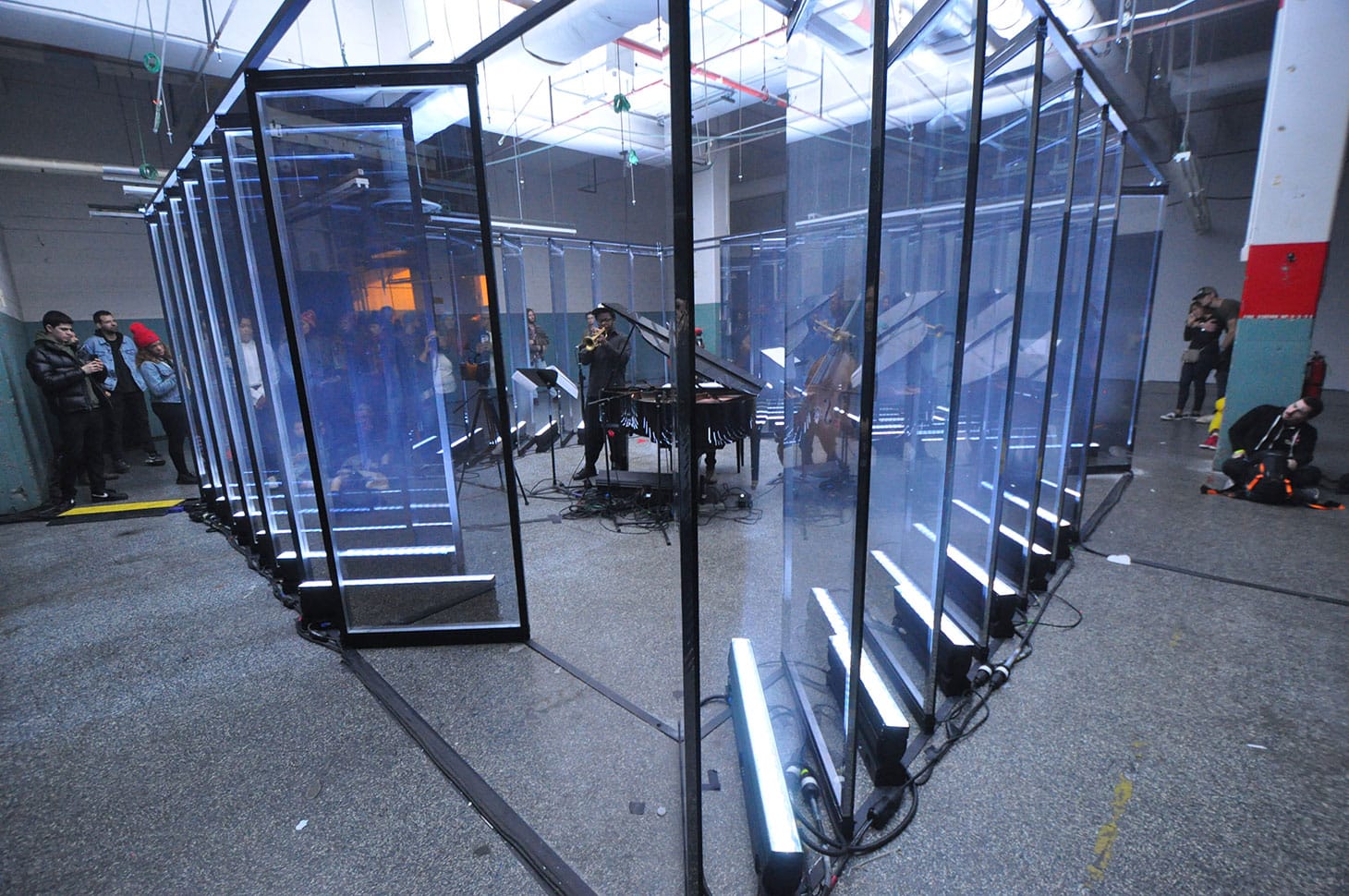 Ijeoma taught himself to read music specifically for this project, so that he could remove notes from the anthem at the same rate as Americans being sent to prison, from the 1920s to today, while pulsating lights traced the passage of time with an uneven beat. When the jazz trio was present, people gathered around and sat on the floor around them to listen; when the musicians went on break, festival-goers roamed the glass box, watching the player piano perform the same, pre-programmed composition.
