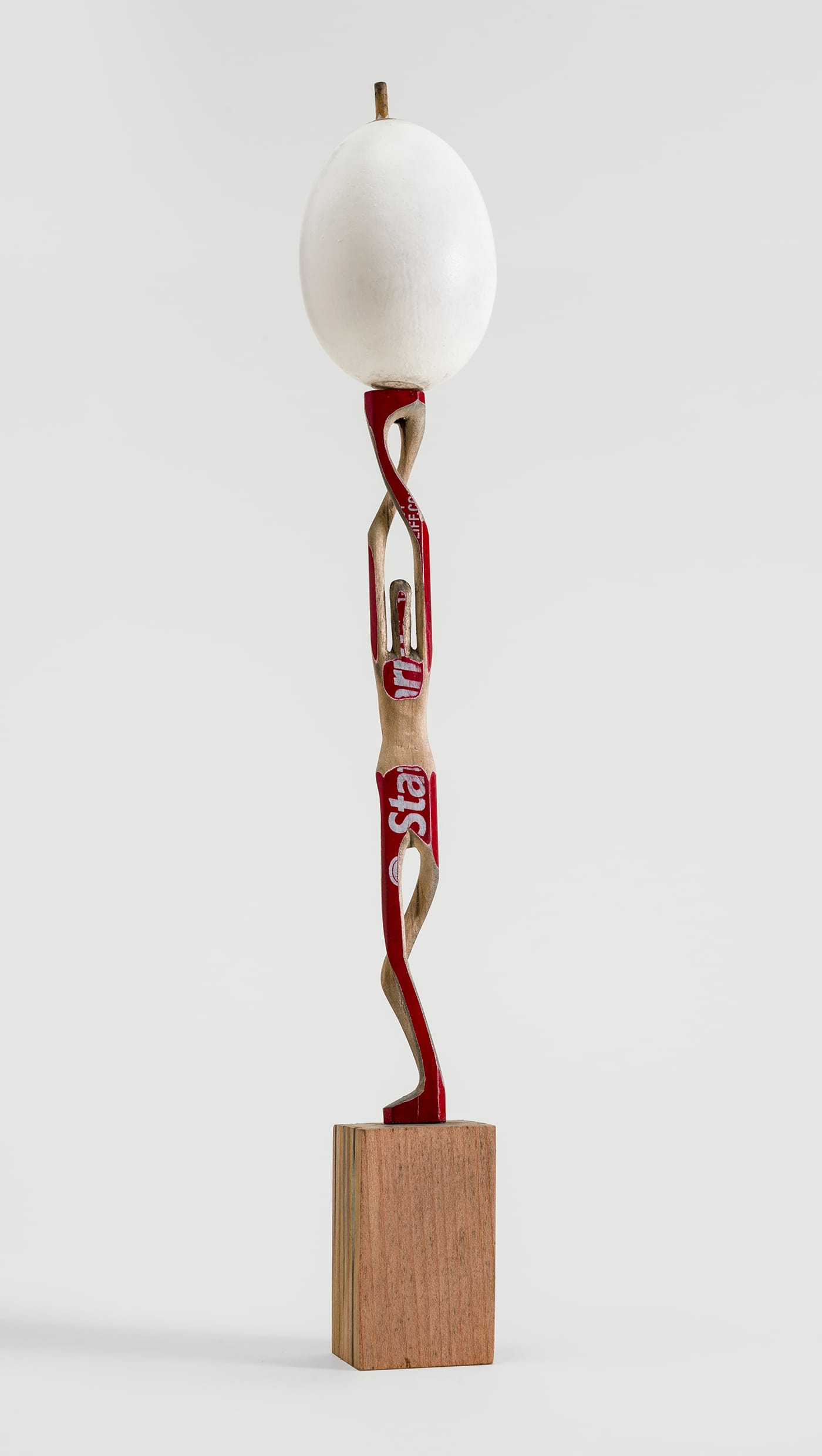 The toilet plunger also undergoes a number of changes in his hands. It becomes a crown, or, by adding a belt and pencils, a tower, “Babel”(2015). His ironically thin “Atlas” sculptures (carved of mahogany or pencil) lift eggs symbolizing the globe, sometimes placed into inverted toilet plungers, reminiscent of the torch of the Statue of Liberty. Likewise, his graphic work, which refers to Far Eastern scroll paintings, also appears to be rolls of toilet paper when looking at “Budi Scroll” (2009).