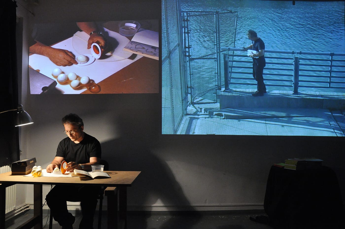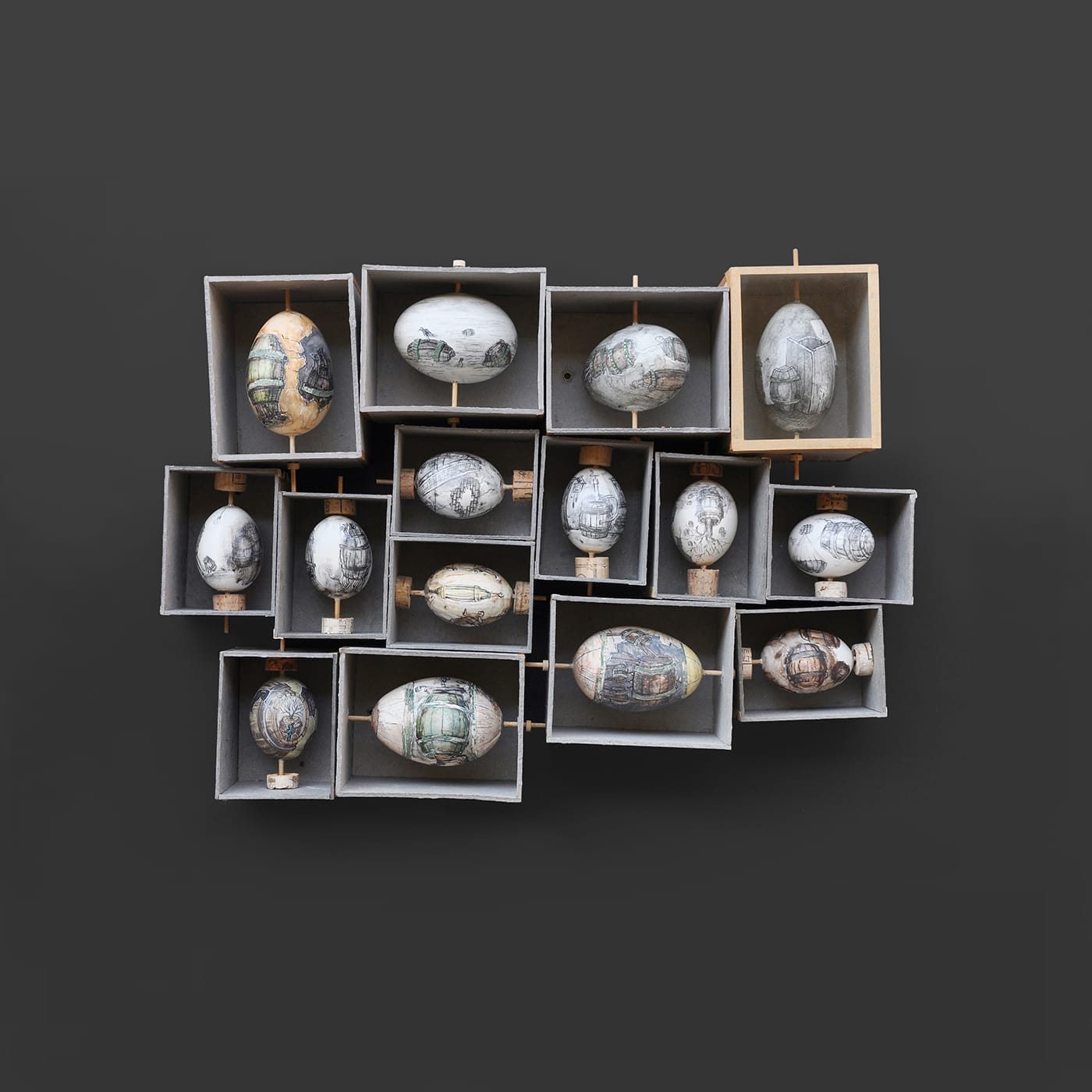 Börocz plays with these objects and their multiple references: The tongue depressors, consistent with the oft-seen medical curiosity of the Wunderkammer, appear as a medical aid, but also as a means of symbolic interpretation of language. The meaning of the pencil for Böröcz, extends from Max Ernst’s frottages to the basic tool for writing (therefore the basis of civilization), but it also is a reflection of nature’s transformation of wood into carbon. The egg evokes cosmological ideas related to it, but the combined use of chicken, duck, goose, and ostrich eggs, the latter being a common exotic element of historical Wunderkammers, also refers to issues of scale. In this pseudo-curiosity cabinet, Böröcz recalls the Hungarian craft tradition of egg shoeing, which demands ingenious levels of technical knowledge and high precision when decorating eggs using combinations of eggs and horseshoes, miniature drawn scenes, or putting magnets into eggs in the performance, “Telehor” (2103) dedicated to László Moholy-Nagy.