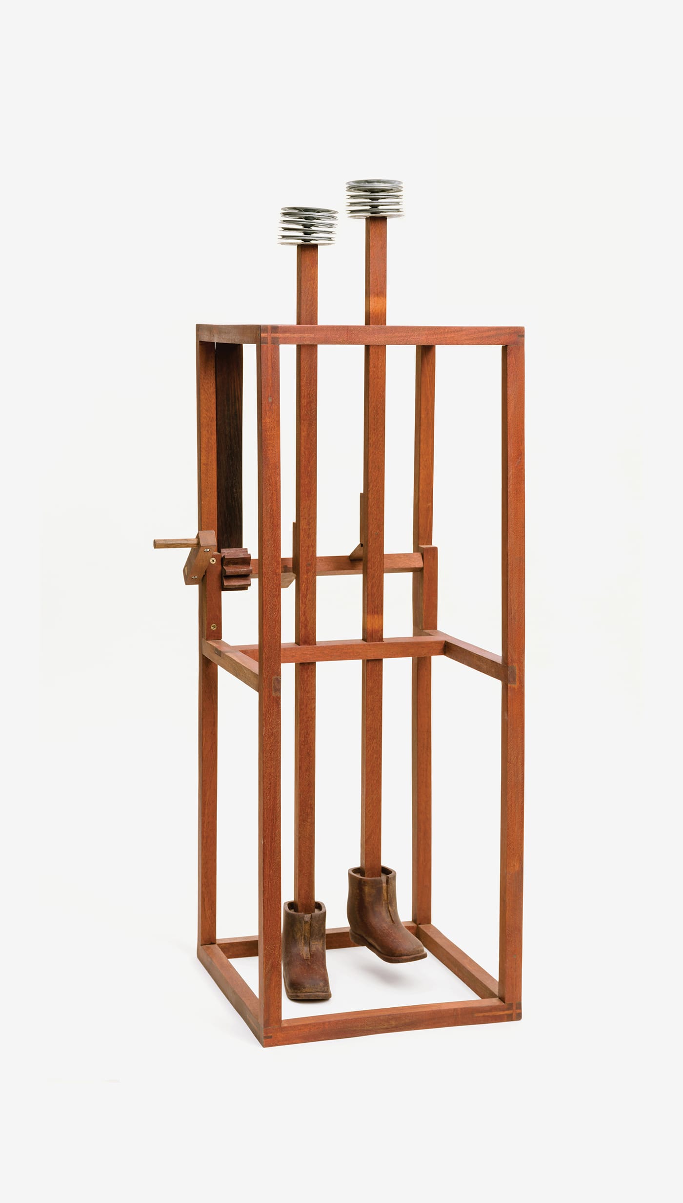 Böröcz’s sculptural installation, “Yad 1–13” (2010), is his interpretation of Torah pointers and activates the rest of the exhibition in the Kunsthalle. These kinetic creations are reminiscent of folding rulers with attached hands that remind the viewer of New York City signal lights, or a cartoon figure’s gloves. The villain Haman appears again. His execution (by hanging) shows up in miniature sculptures enclosed in impossible bottles, “Haman & his Ten Sons” (2001) that serve a double purpose, to also be used as noisemaker instruments. This iconography appears in Böröcz’s collection as part of his exploration of a gallows. Gallow-shaped pages appear in “Lipton, The Gallows Book” (1992), linking Sir Lipton and Stalin; they are burnt into recycled wood slats in “Gallows Drawings 1 – 21” (1994) or in “The Hanged” (1989), a 17-figure sculpture installation to commemorate the executed victims of the 1956 Revolution.