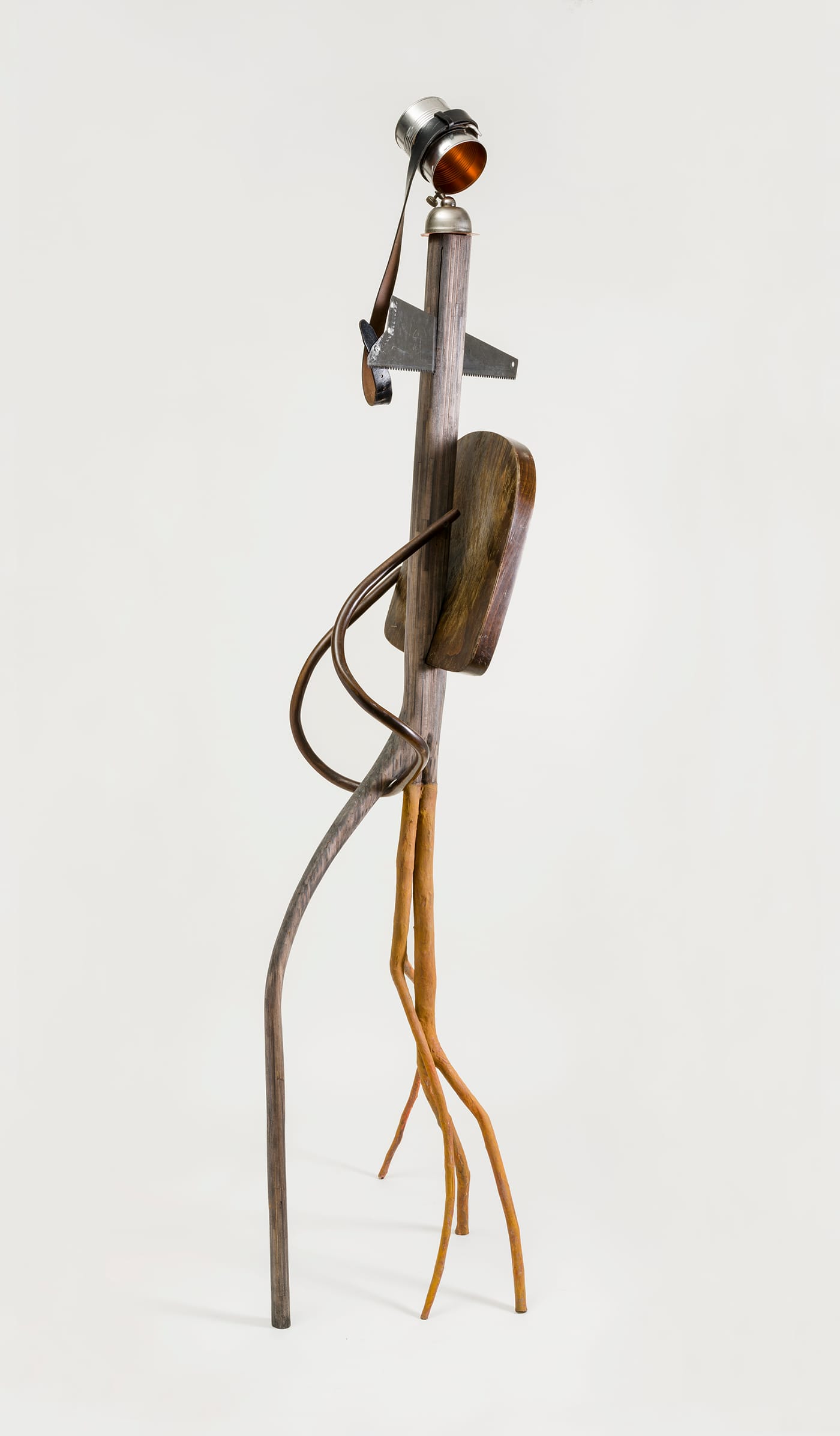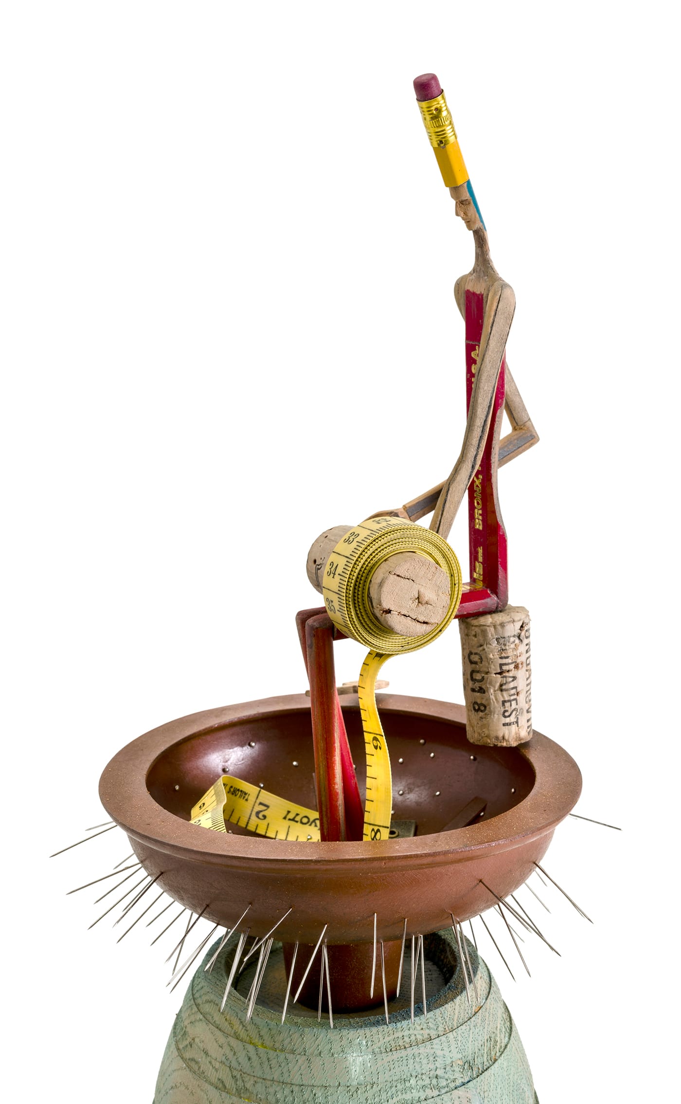 The collection includes sculptures (so-called Hybrids) assembled from branches found in New York City parks or the artist’s own garden, often paired with various discarded objects. Sometimes the original form of the items is preserved, other times they become completely figurative. The pencil as a sculptural material appears in several forms: strange creatures carved from black (graphite) or colored pencils with different inscriptions, on pedestals or placed in genre scenes to reflect the human world. At the same time, Böröcz uses thousands of laminated pencils that are carved into trompe l’oeil plastic creations. Despite the humble materials of Böröcz’s works, they lack the rawness of bricolage. His pseudo-collection evokes the craftsman figure, which is uncommon in contemporary discourse, with his virtuoso professional knowledge, but also his humility and serenity.