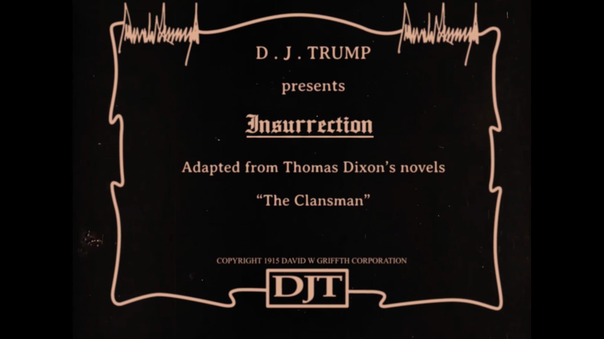 There are two frameworks to Insurrection, twin cinematic storytelling modes that don’t conflict with one another, but don’t ever gel, either. The film is in part an epistolary documentary, using shaky smartphone footage from the riot as well as snippets of film from the Great Depression, Civil Rights protests, and other moments of great consequence. Insurrection also presents itself as a production by former President Donald Trump, based on Thomas Dixon Jr.’s racist 1905 novel, The Clansman: A Historical Romance of the Ku Klux Klan. Grainy black-and-white title cards evoke the golden era of silent film, but otherwise, this meta-fiction conceit goes nowhere.