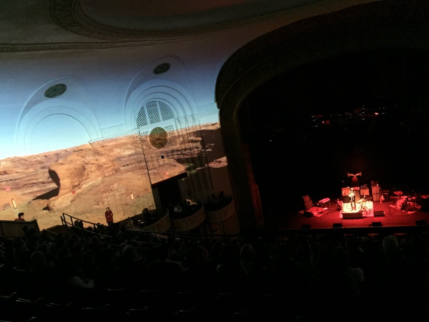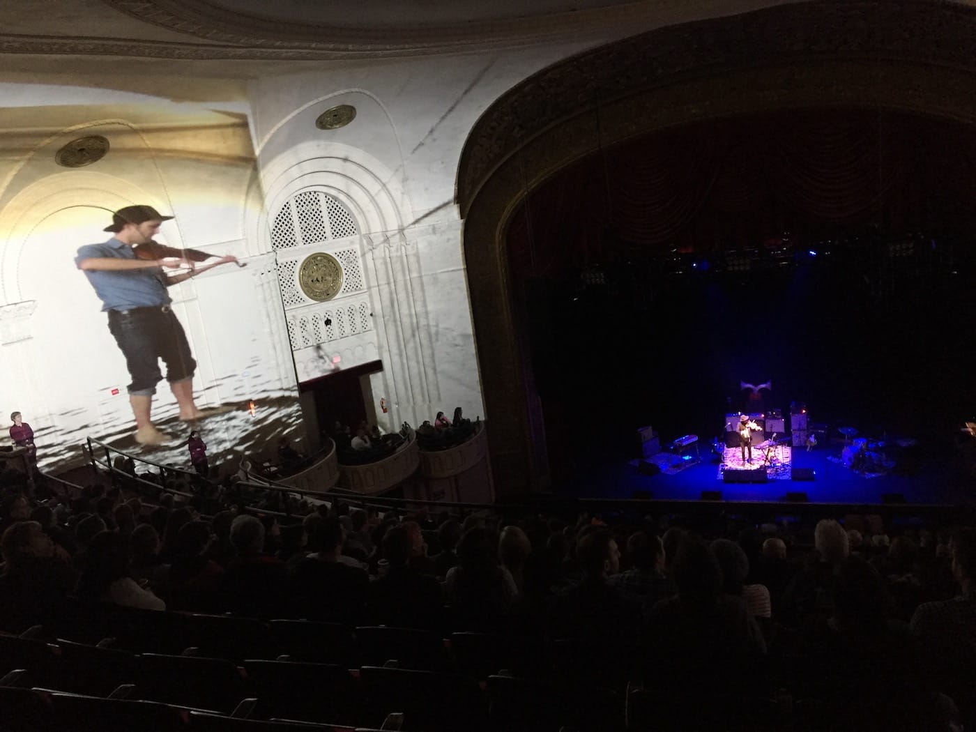 During the performance, the real-life Andrew Bird, playing violin on stage, was dwarfed by his own moving image. It made the venue seem cavernous — both because the Capitol Theatre is several stories tall, and because, like a canyon, it’s all curves and no corners. For the sake of acoustics, the ceiling of the theater is an ornate dome, surrounded by sloping walls and sweeping arches.