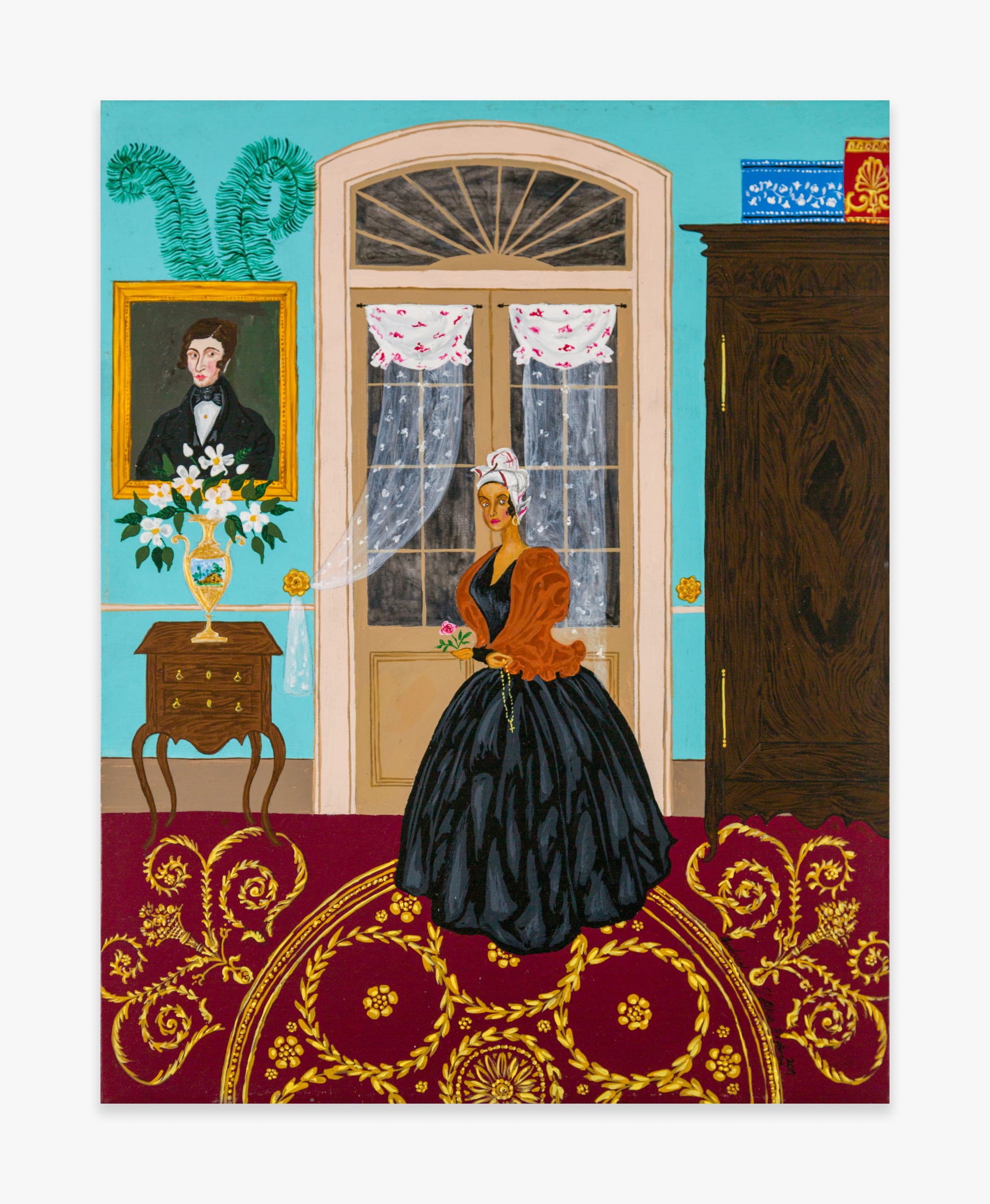 As a child, Hopkins, who is a gay, mixed-race Black man and a Francophile, became fascinated by this period of prosperity for Creoles of color, an oft-overlooked history in narratives of the Deep South. Hopkins paints fictional as well as historically significant Creoles — perhaps most notably New Orleans “Voodoo Queen” Marie Laveau, whom he renders four times in the exhibition — in stiff, doll-like poses, standing in front of lacquered building facades or posing within marbleized interiors. The artist’s historically accurate depictions of the period’s creolized fashion, décor, and architecture celebrate the protean material culture of the time: for example, Creole townhouses that adapted French colonial architecture to a Southern climate using windows and transoms, or decorative schemes that interspersed Louis XV tables and Louis Philippe chairs with chests from Philadelphia and tables from New York.