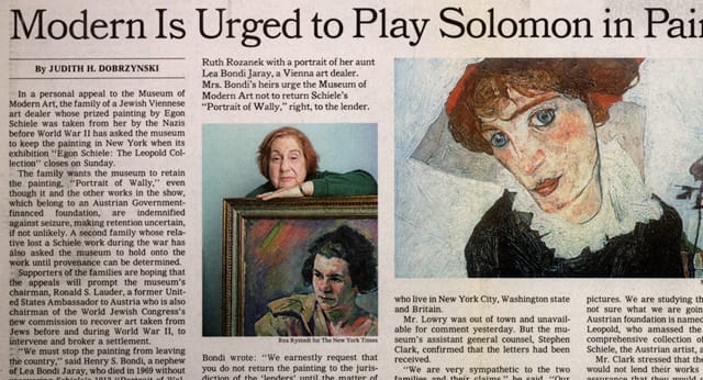 When heirs of Bondi noticed “Portrait of Wally” in the 1997 MoMA show, they beseeched the museum not to return the painting until its provenance could be determined, but the MoMA declined, citing contractual obligations to the Leopold Museum. Manhattan District Attorney, Robert Morganthau, stepped in and subpoenaed the painting. That was just the start of the legal morass (involving the State Court of Appeals and US Attorney’s Office) that would keep the painting in a warehouse until 2010, when a settlement was reached among the Leopold Museum, the Bondi heirs and the US government.