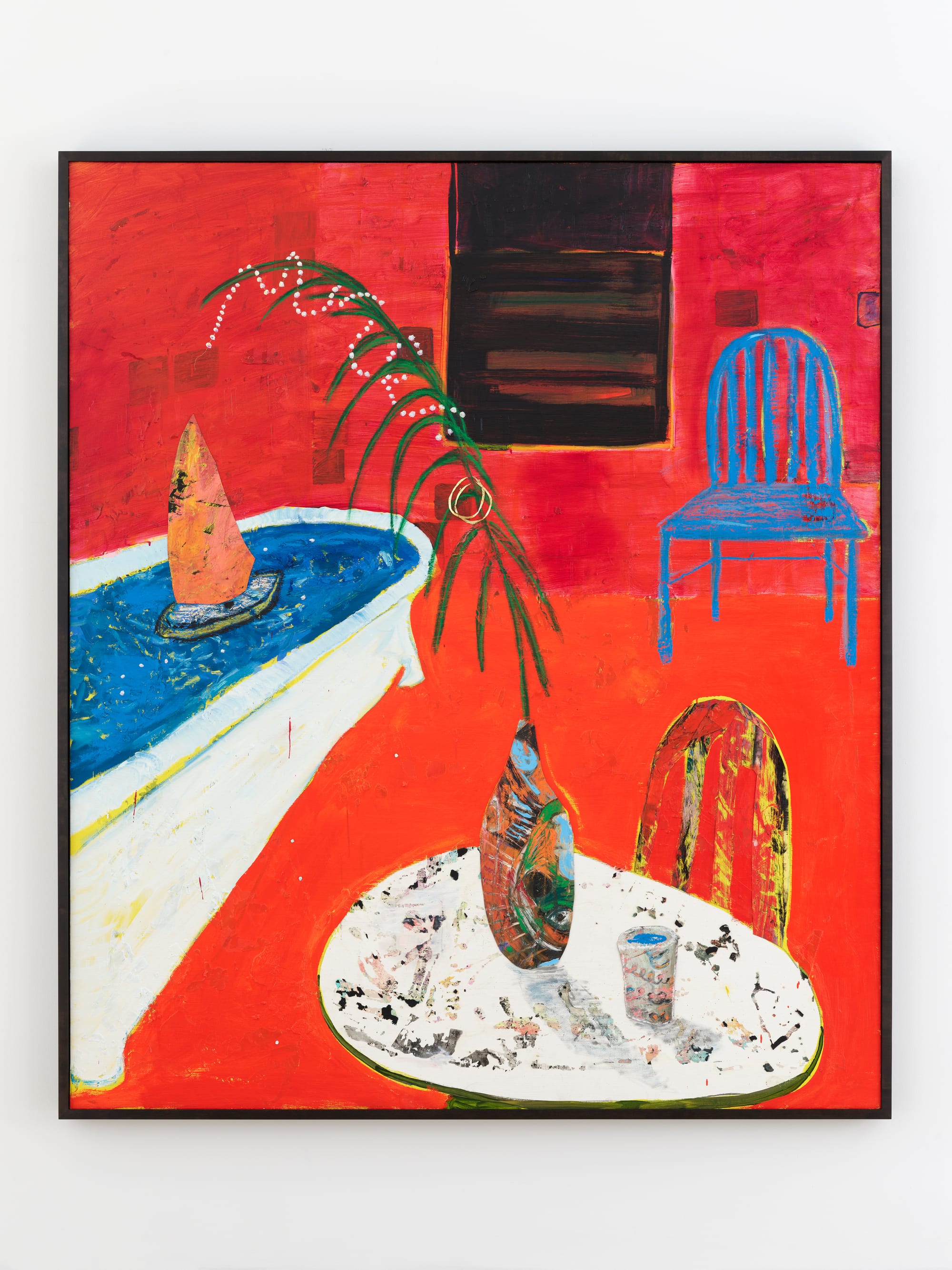 Six other works are installed in the second gallery, among them "Fishing Pearls" (2020), a strange bathtime mise-en-scène. A sailboat floats in a porcelain tub, and in the foreground, a little white table is minimally set with a water glass and a vase holding a bejeweled palm leaf. Otero has drenched the floors and walls in shades of vermilion that inevitably bring to mind Matisse's "L'atelier rouge" (1911). But no sooner has one relished in the sanguine composition than its bizarre components become starkly evident. Why is the only window blacked out, leading nowhere? The space looks like a patchwork of different rooms from different houses, evoking that foreign-yet-familiar sensation that governs dreams; that maybe also governs Otero's memories.