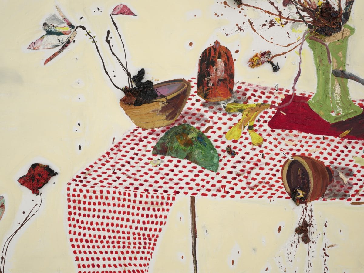 The masterpiece is "An Angel at My Table (After Exquisite)" (2021), a generously collaged work whose imagery, a checkered cloth-covered table in delightful disarray, is inspired by a painting the artist made over ten years ago. Here, Otero has allowed himself every creative and material liberty. Glued to the surface are textures as diverse as a pigment-stained rag; a fat clump of oil paint; a baseball-themed jigsaw puzzle; bits of aluminum foil; and photographs of a caning pattern that reference both Picasso's synthetic cubism and, perhaps, his great-grandmother's wicker chair. Painted flowerpots and plates are suspended in mid-air in this capricious, gravity-defying still life.