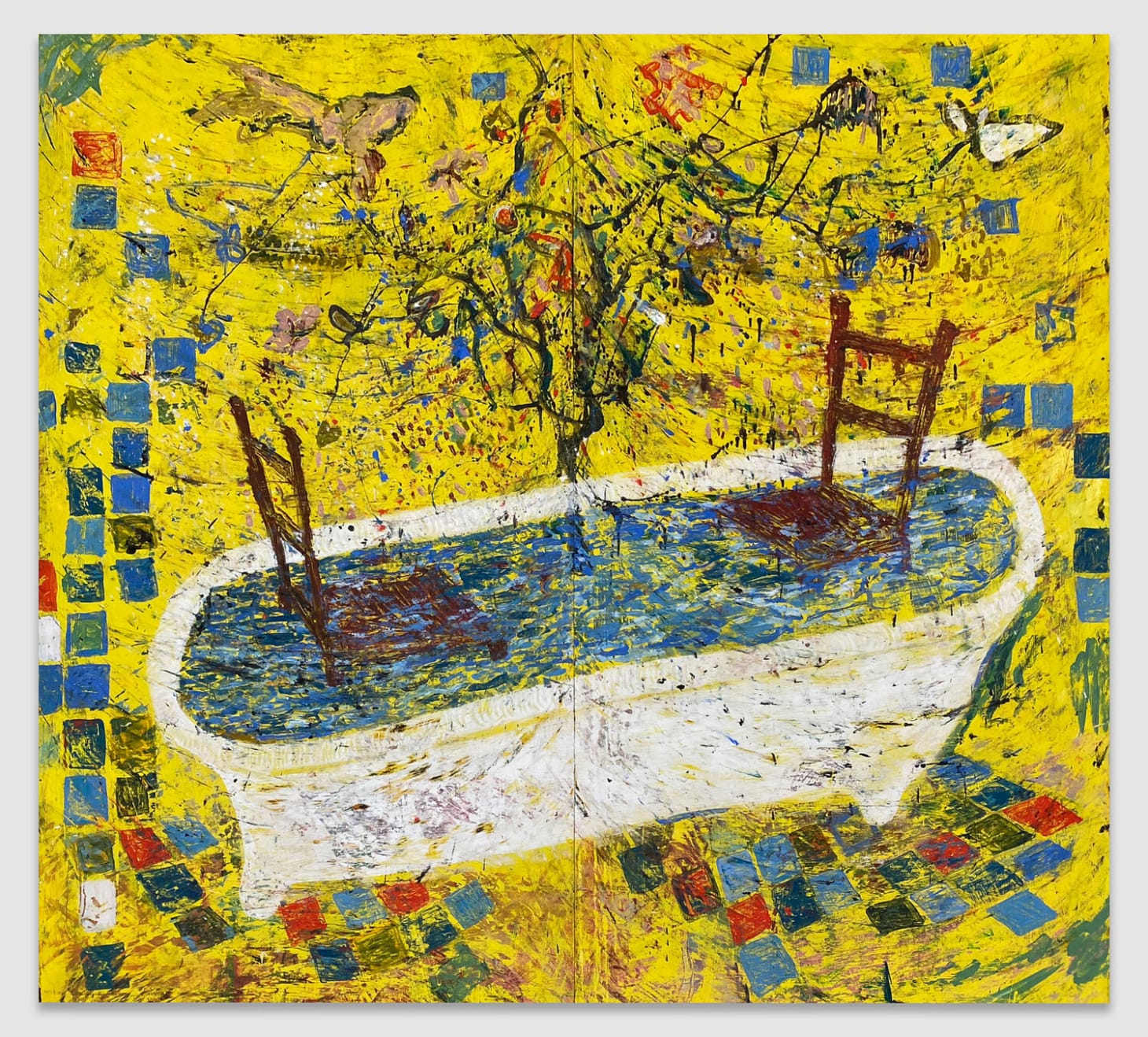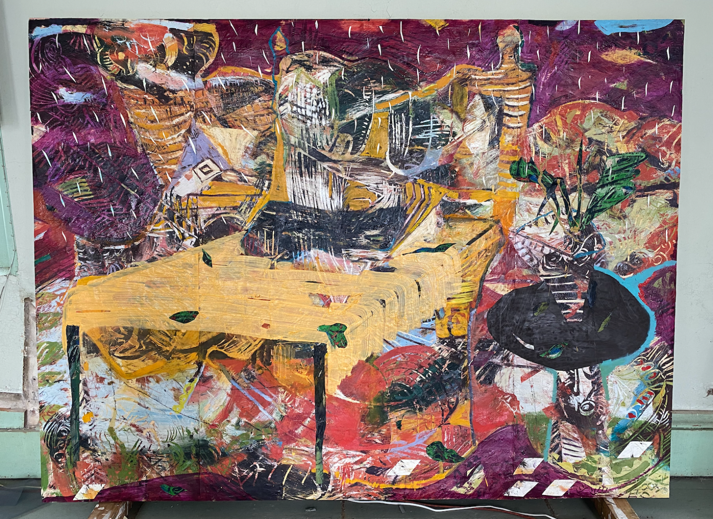 AO: It planted this urge for me to reconsider the way I incorporate certain memories. I had a group of old paintings in my Brooklyn studio, some made ten years ago, that I didn’t feel were particularly successful — they were abstract and grounded in art historical references, Picasso, de Kooning, Gorky — but they still felt a bit vague to me. I mounted them on a truck and drove upstate, and used them as a sort of starting point to paint compositions based on different interiors, primarily from my grandmother’s house in San Juan, where I was raised. I drew the bathtub, the dining room table, the different kinds of tiles, the chairs, the windows, her flowers … All these elements read to me as still lives: they were representational, though very distorted. But for me, it was an opportunity to paint something that was truly mine. My intention with this work is not to tell a story about growing up with my grandmother in Puerto Rico — the memories are just my best excuse to jump into the canvas.