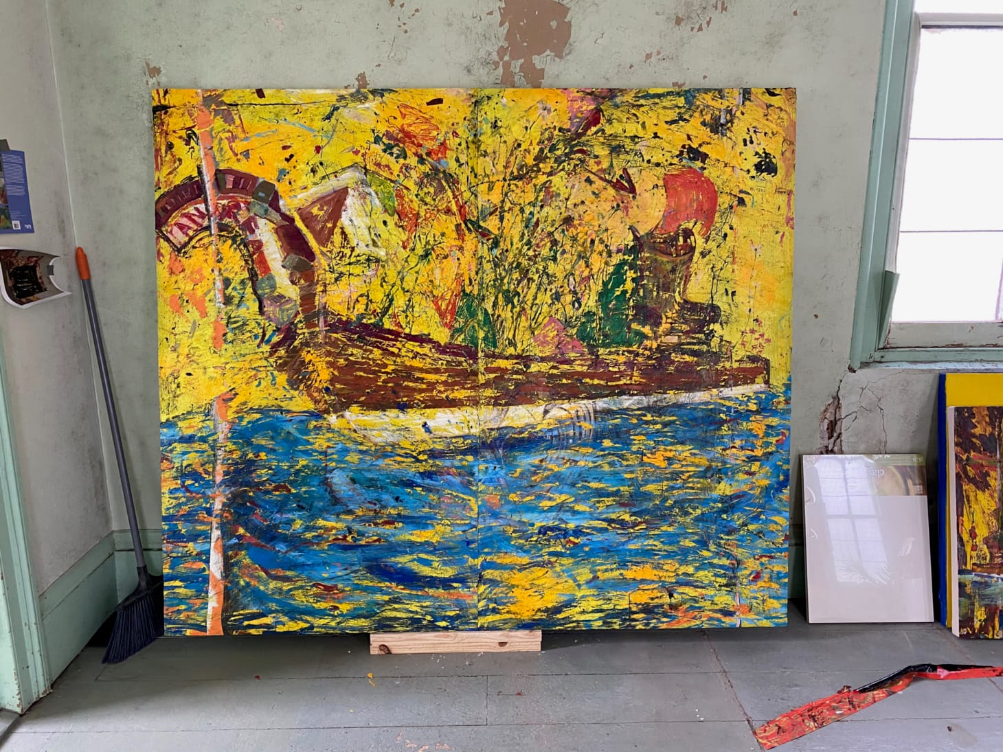 AO: I had a boat like this one years ago, which we call a dingy, in Puerto Rico. I always used it to go fishing by myself, and it was kind of my little escape out there, very personal. When I started making these new paintings, I felt that those works had such a strong relationship to what we’re dealing with now: the solitude, the idea of being alone. It was very curious to see how something that I did back then was very resonant now. Because my grandmother had so many plants around the house, I added these plants around everything — it’s almost like it’s her in the picture.