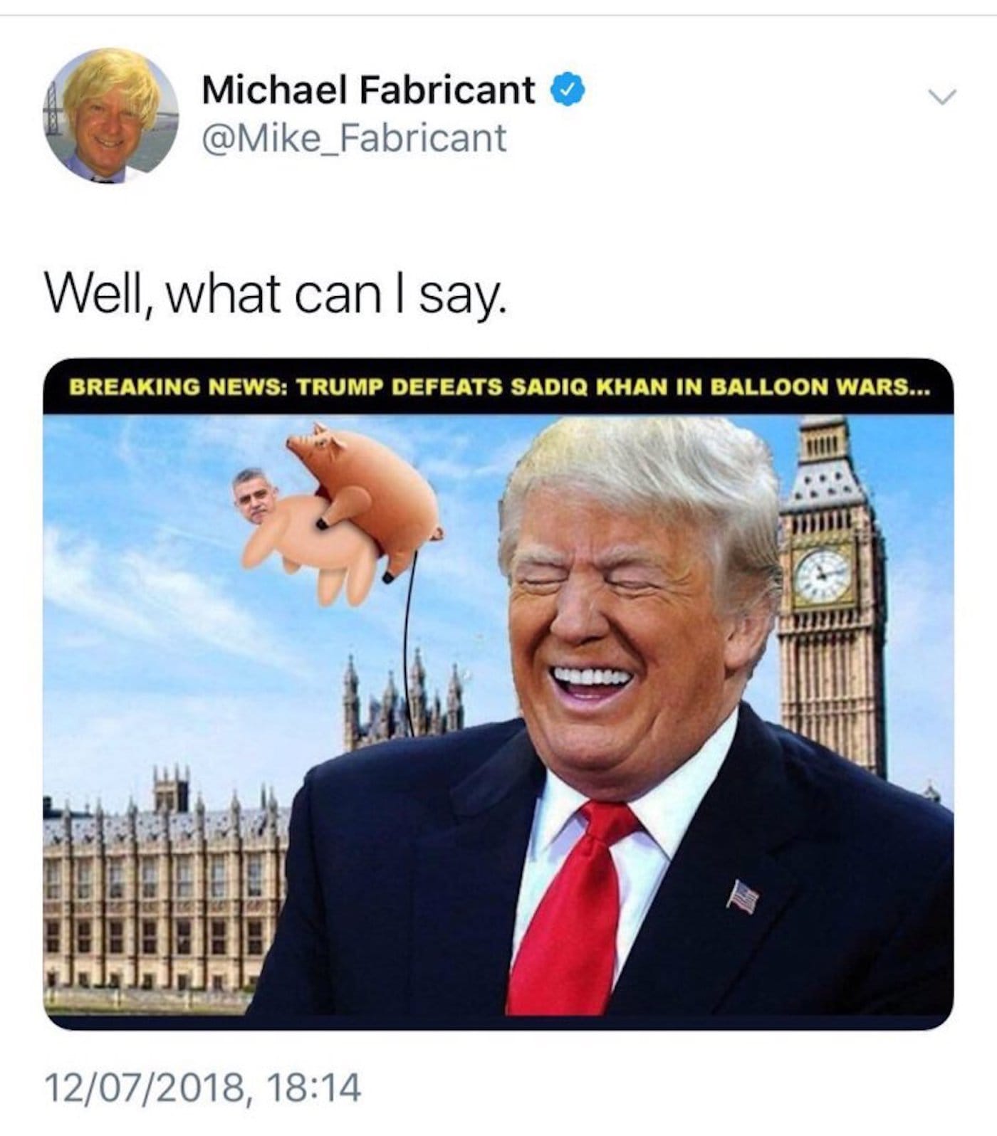 Not everybody is playing nice, though. Conservative Tory and British MP Michael Fabricant faces calls for suspension after posting his own retort to Trump Baby on Twitter — a mock-up of two pigs having sex where one pig has the face of London Mayor Sadiq Khan. The image also includes a cut-out of Trump laughing with the headline, “Breaking News: Trump Defeats Sadiq Khan in Balloon Wars … ”