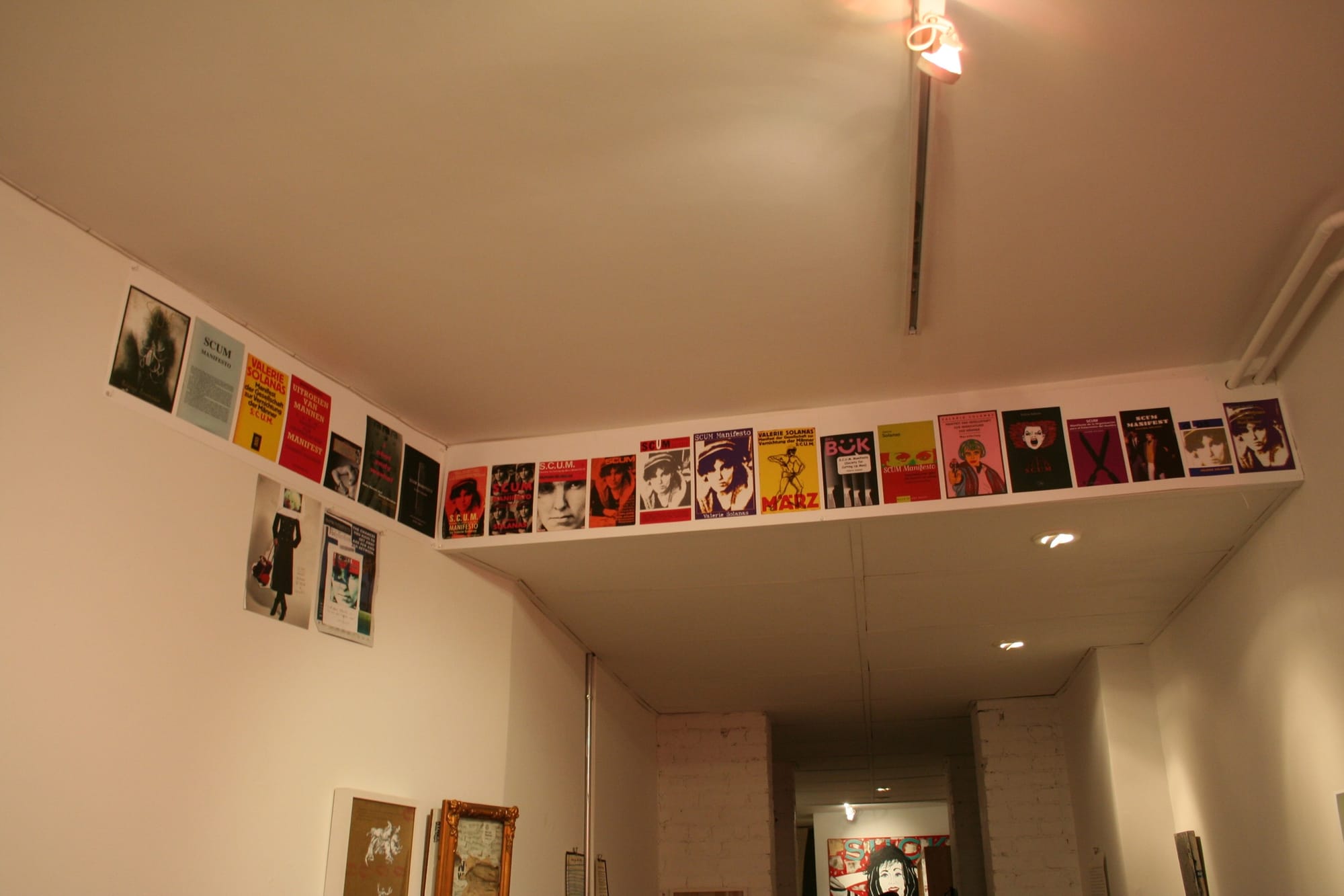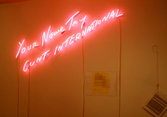 Though the show is positioned within the traditional context of the commercial gallery, the display and format of the exhibition is decidedly unconventional: works are pinned haphazardly to the walls and clustered together in vitrines, covering virtually every available part of the gallery. In one corner, an old television monitor stacked on a pile of books displays Genesis Breyer P-Orridge’s video “Eva Adolf Braun Hitler” (2002) with a manila folder containing a selection of samples from Ridykeulous’s “Man Art” archive on top; lining the doorway between Invisible-Exports’ two rooms is Catherine Lord’s “Global Feminism” (2011), depicting the covers of various international editions of Valerie Solanas’s S.C.U.M Manifesto. Steiner and Eisenman make no distinction between discrete works of art and letters or texts by artists; a piece like Tracy Emin’s “Your Name Try CUNT INTERNATIONAL” (2004), a wall-mounted sign in lurid pink neon, is placed alongside an undated letter from K8 Hardy to her gallery, Reena Spaulings Fine Art, in which she lambasts their attempts to interfere in an exhibition of her work and what she describes as the “patriarchal view of success” that equates sales with cultural relevance.