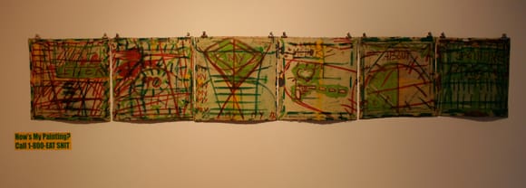 Many of the works offer a similarly satirical take, lampooning various aspects of the art world. Kathe Burkhart’s massive painting “Suck My Dick” (2004), from her Liz Taylor series, depicts the actress unzipping her pants to reveal a massive black dildo attached to the canvas with the words “SUCK MY DICK” emblazoned over her body in turquoise paint. Lined with singed rejection letters received by the artist from museums, galleries and publishers, the painting is a bold message of contempt for her detractors. Gary Gissler’s painting “Fucking Asshole” (1998) appears, at first glance, to be a minimalist grid, but upon closer inspection, its gray lines are revealed to be the phrase “fucking asshole” scrawled repeatedly in tiny letters; William Powhida’s drawing “Rant” (2010) contains a profanity-laced diatribe against Bravo’s reality television show “Work of Art,” painstakingly rendered by hand in various typefaces.