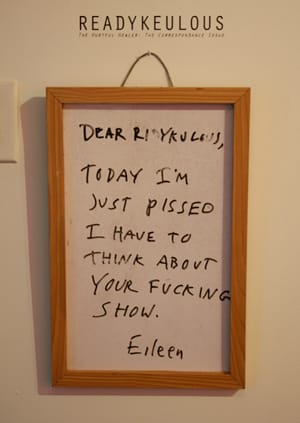 As the curators point out in the press-release, “we have chosen at this point in time to highlight our letter-writing skill-set,” and the majority of the show is dedicated to what participating artist William Powhida described as “angry letters.” The display encompasses archival correspondence, works of art incorporating text and other fragments, including a sticker placed below Louise Fishman’s six-panel painting “Letter to my mother about painting” (1972-73) reading “How’s My Painting? Call 1-800-EAT-SHIT,” as well as ephemera related to past Ridykeulous activities. The confrontational tone of the exhibition is immediately apparent: the first work on view is a dry-erase board with a message by poet Eileen Myles reading “Dear Ridykulous, Today I’m just pissed I have to think about your fucking show. –Eileen.”