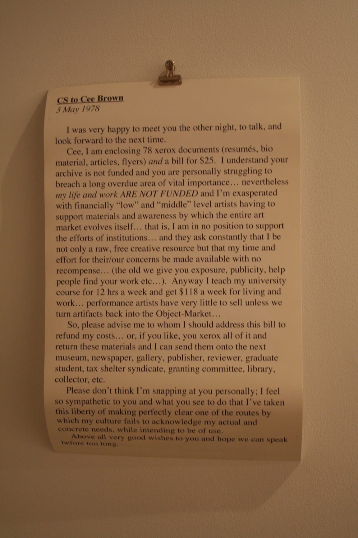 The exhibition check-list similarly provides titles, dimensions, and media for each item, regardless of whether it is an email printout or a painting. Each artist’s contribution is treated equally, rejecting the hierarchal division of different modes of artistic production and the privileging of that which can be easily sold. The lack of wall labels distinguishing between works adds to the sense of a collective project; this isn’t the sterile white cube of reified objects and quiet contemplation, but a space in which various voices demand to be heard.