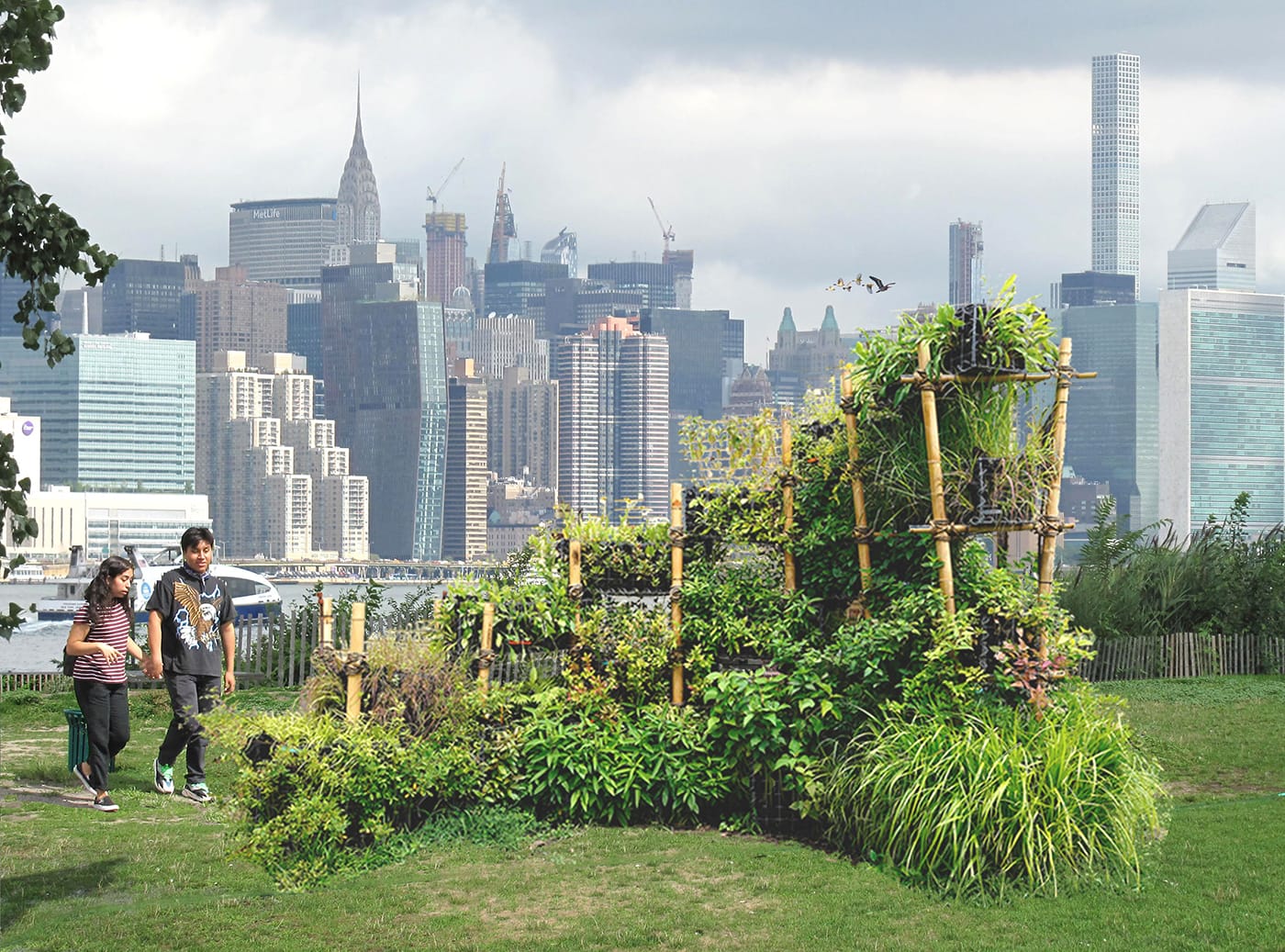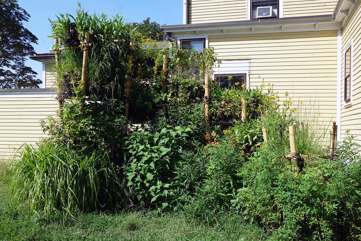 This summer’s prototype on Governors Island was part of New York City Audubon’s Nature Center and involved a nine-foot-tall plant wall installed outside one of the island’s former military homes. Its native plants, donated by the New York City Department of Parks & Recreation, were each rooted in separate containers that were supported by a bamboo structure. As the summer rains caused the plants to flourish, blueberries, purpletop tridens, black-eyed susans, and other flora attracted birds and bumblebees. The spiraling form of “Birdlink” is constructed from repurposed and affordable materials so as to be visually engaging while also feasible to deploy at multiple sites.