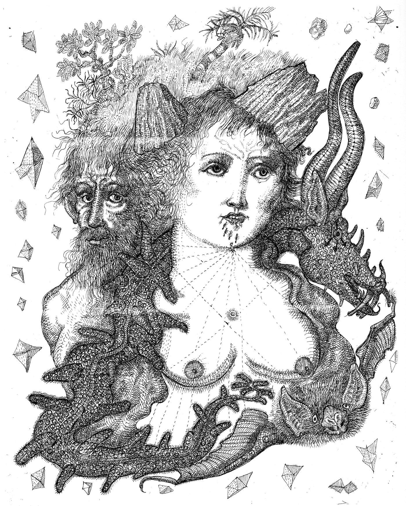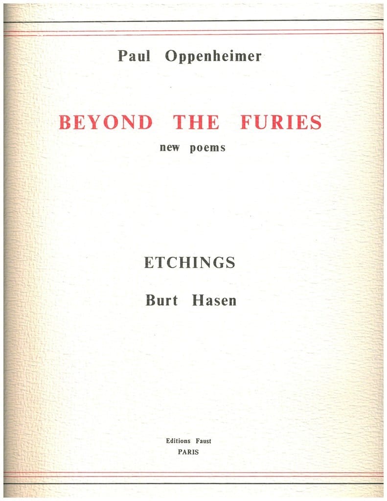 His etchings are populated by figures in varying states of metamorphosis; transitioning from human to animal, singularities to pluralities, background to foreground, inanimate to animate. His ten original etchings illustrate Paul Oppenheimer’s book Beyond The Furies.