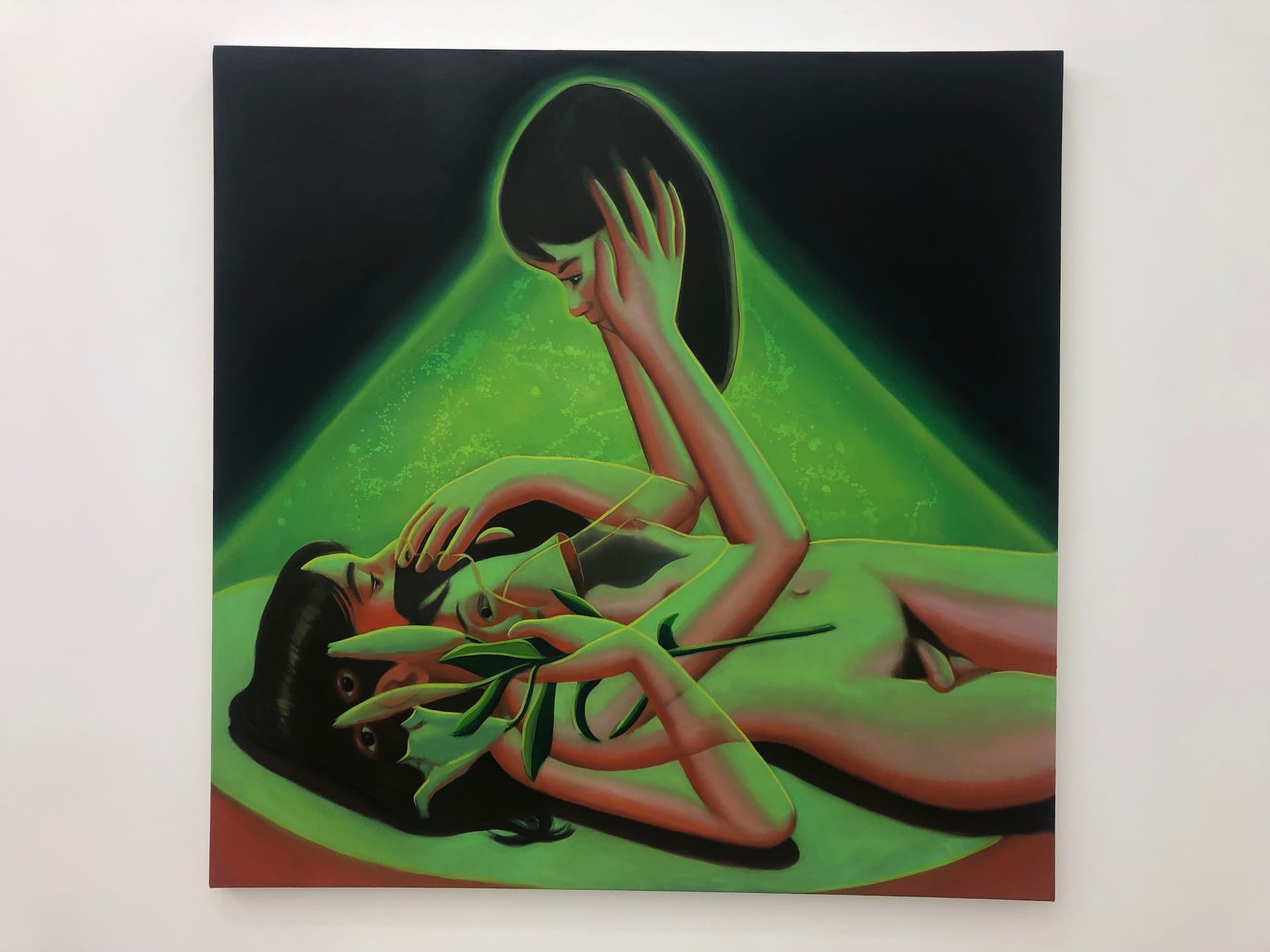 LOS ANGELES — Existential unease fills the air between the walls of Unknot, a solo exhibition of paintings by Anja Salonen at in lieu, her first at the gallery. Salonen’s image choices cull up memories of Surrealist paintings in their absurdity, yet their colors are all spectacle, dripping with the kind of flooded, unnatural lighting typical of minimalist theater. Perhaps it is the dramatic lighting that brings the films of David Lynch to mind, or maybe it’s the emotionally vacant cow situated behind a seemingly floating woman in Salonen’s "Hysteria" (2022), who is upon second glance actually arched face-up across a farmer’s knee.