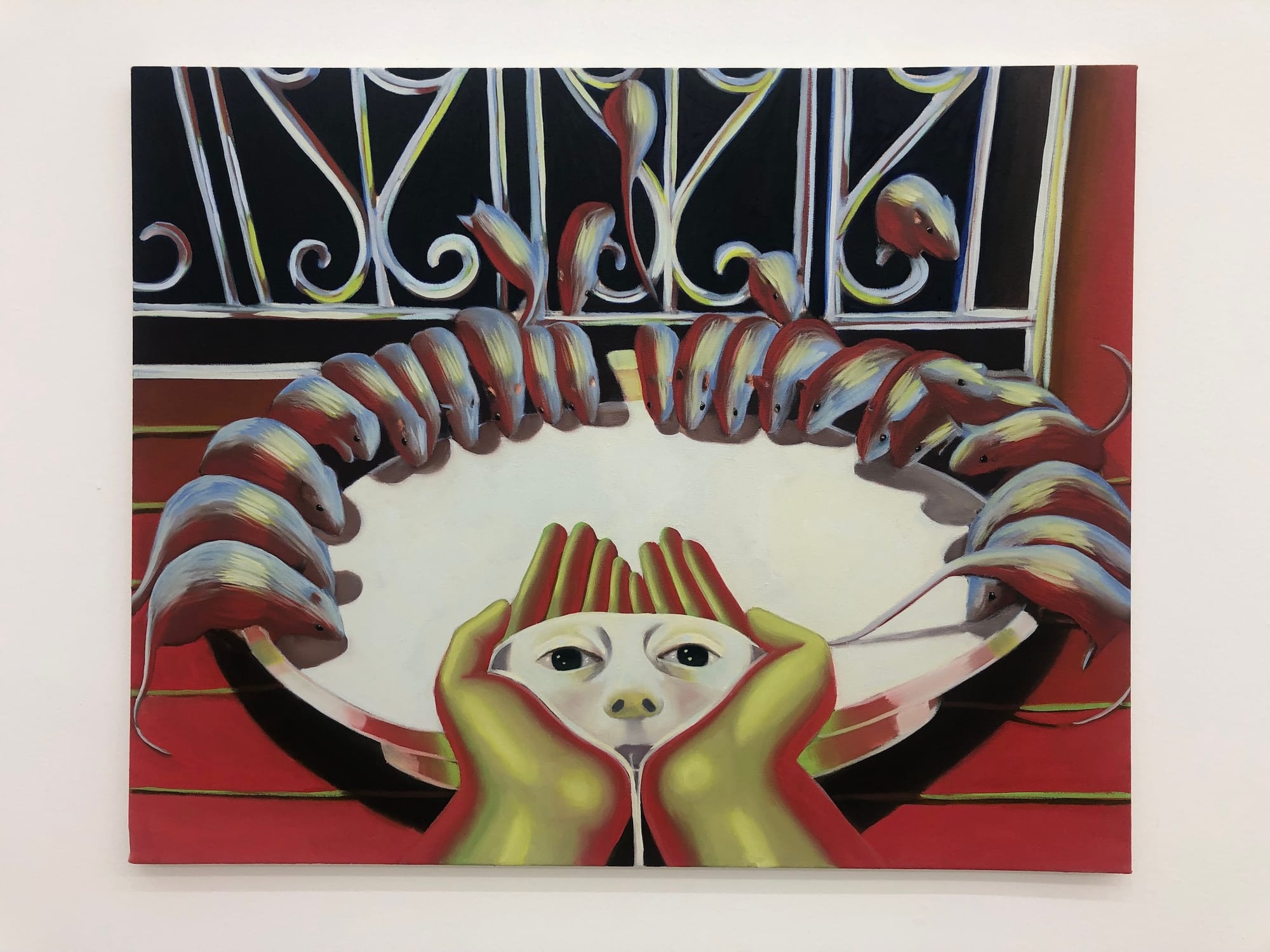 In "Time Lick in Red," a mysterious hand swings a timepiece back and forth in front of a figure’s blank stare, a cliché depiction of hypnosis, while in "Rat Temple Milk" another set of mysterious human hands cup together to lift milk from a large bowl where rats dine in multitude (both 2022). Reflected in the milk is the presumed face of the figure, yet while the hands are human, the face is that of a rat. In both artworks, we get a kind of fusion of cinematic eeriness and painterly mystery — as if Salonen has created some sort of suspense-driven soft-horror film in which the painting’s characters are actors and all we get are these film stills to see.