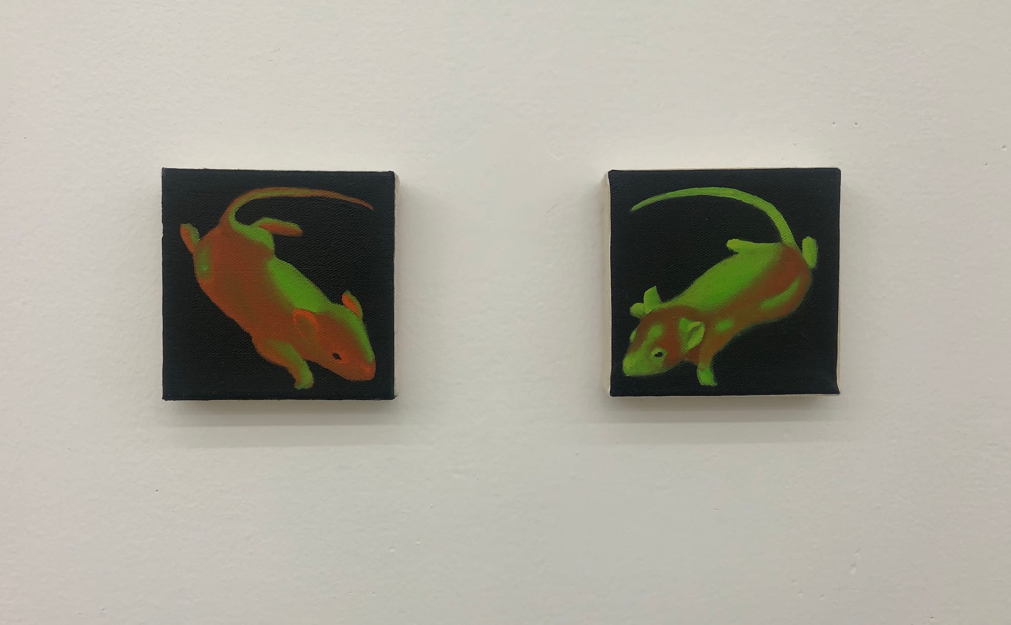 Nearby "Green Fluorescent Protein 1" and "Green Fluorescent Protein 2" (both 2022) depict one bright-orange-and-green mouse each. At four-by-four inches, the paintings are quite small and the mice they contain fill their frames, giving the impression that they, like the lab mice they reference, are trapped. Another painting, "Partial Metamorphosis (Pre Tail-Absorption)" (2022), also feels like a depiction of a science experiment. Using the same bright-orange-and-green lighting, two hands cup together to hold a small amount of water in which several tadpoles swim. The scene could as easily be innocent, a child’s science experiment perhaps, as it could be nefarious. Either way, I am nervous for those tadpoles.