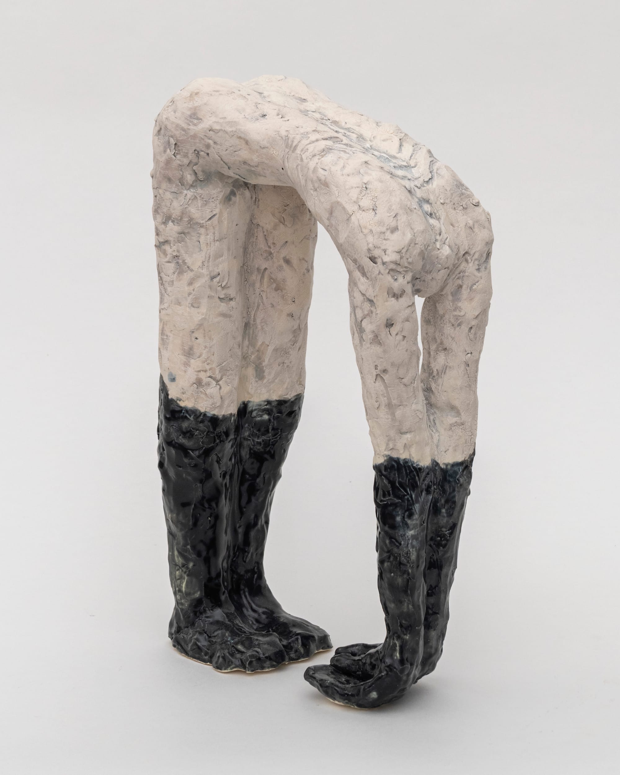 There are 40 works done in different mediums (oil paint, ceramic, thread, mixed media on paper, thin branches), dated between 2015 and 2026, in the exhibition. Consisting of dark blues, blacks, grays, whites, and occasional yellow and green, King’s moody palette underscores Norway’s polar night, when the sun does not rise above the horizon for six weeks to over two months, and there is often a “blue hour” twilight rather than pitch blackness. Working tonally, she renders her featureless, long-limbed figures against painterly abstract grounds. The flatness of these individuals against a monochromatic ground creates a painted world, rather than a spatial one. By separating it from this one, she evokes an interior space.