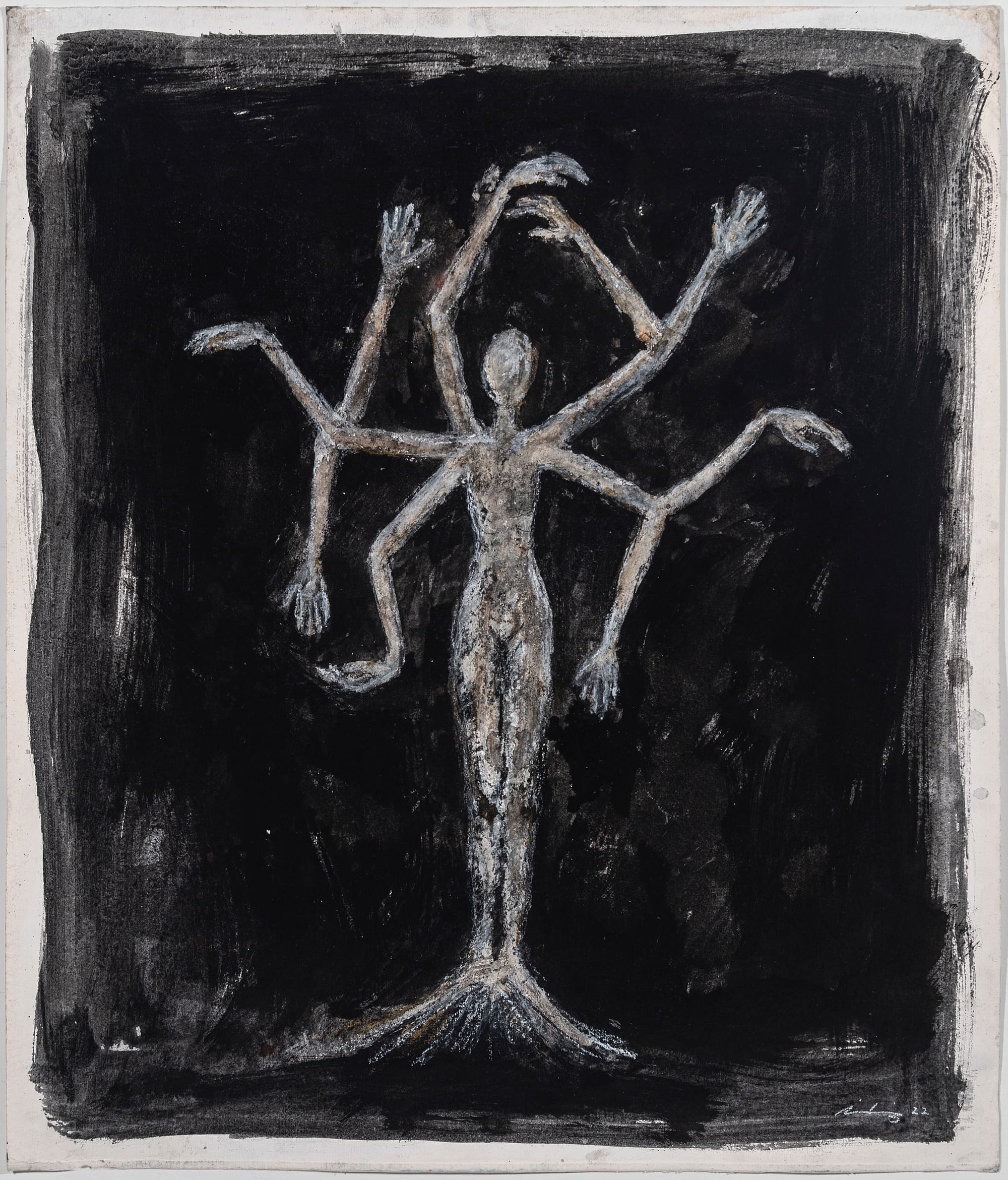 Another common motif across these works is the figure of a woman with leafless branches growing out of her body. Is she a powerful being evoking rebirth, our inescapable return to earth, or both? As pared down as these works can be, there are many ways into them, all of them inflected by King’s chthonic palette and gift for mysterious detail. What is the viewer to make of the foot, ankle, and hands of a figure that is black and distinct from the gray body and limbs? Is it outerwear, oil, or blood from the earth that coats the anonymous being?