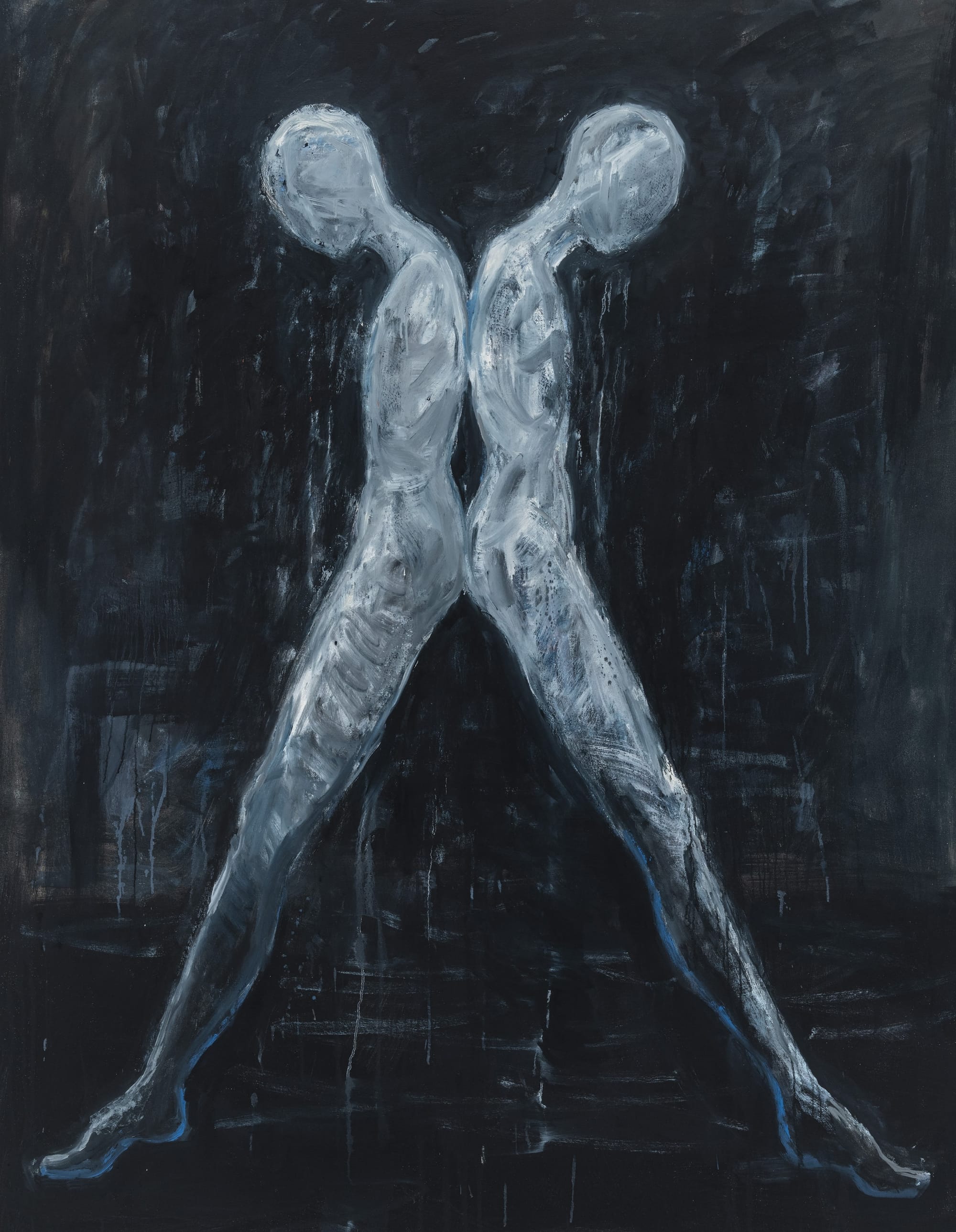 In several of the paintings, two identical figures either face each other or look in opposite directions. Again, the question arises: Are they wordlessly communicating, especially if they are leaning against each other for support? Does one surrender one’s identity to gain that support? A pervasive sense of self-containment, isolation, and miscommunication flows through the work. The stillness of the figures conveys a state of calm and acceptance, adding another layer of meaning. Is isolation an inescapable condition? Have the two figures, at least, agreed on a common language by which they can communicate?