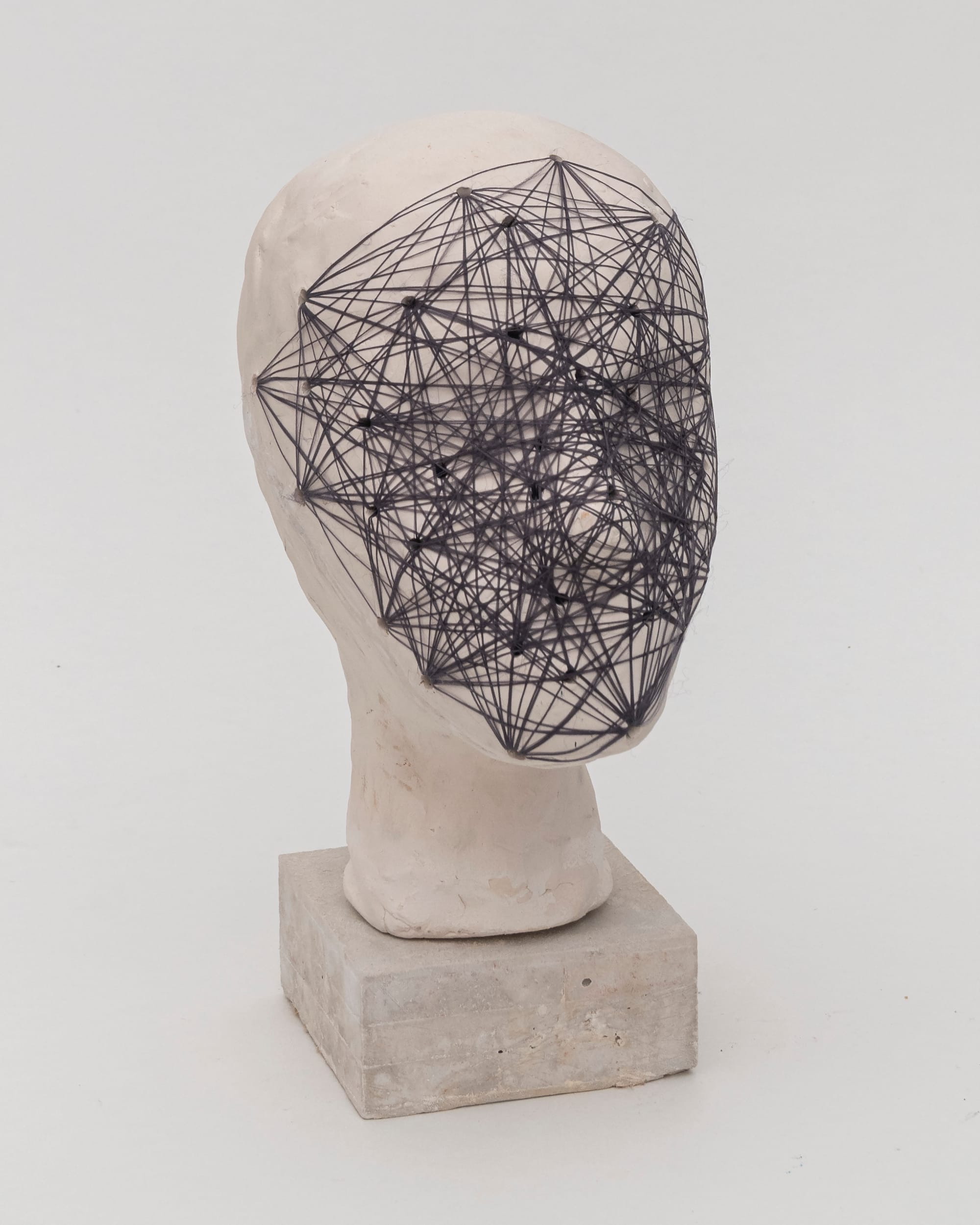 Working with a slowly expanding lexicon of motifs, King explores states of isolation whose circumstances and origins we cannot name. This ambiguity infuses the work with a commanding visual power. She pierces her featureless black or blue ceramic heads with holes through which she threads yellow lines, creating nets over individual faces or connecting heads that face each other with a dense yellow cone of crisscrossing threads. Is one drawing energy from the other, seeing beneath the other’s façade?