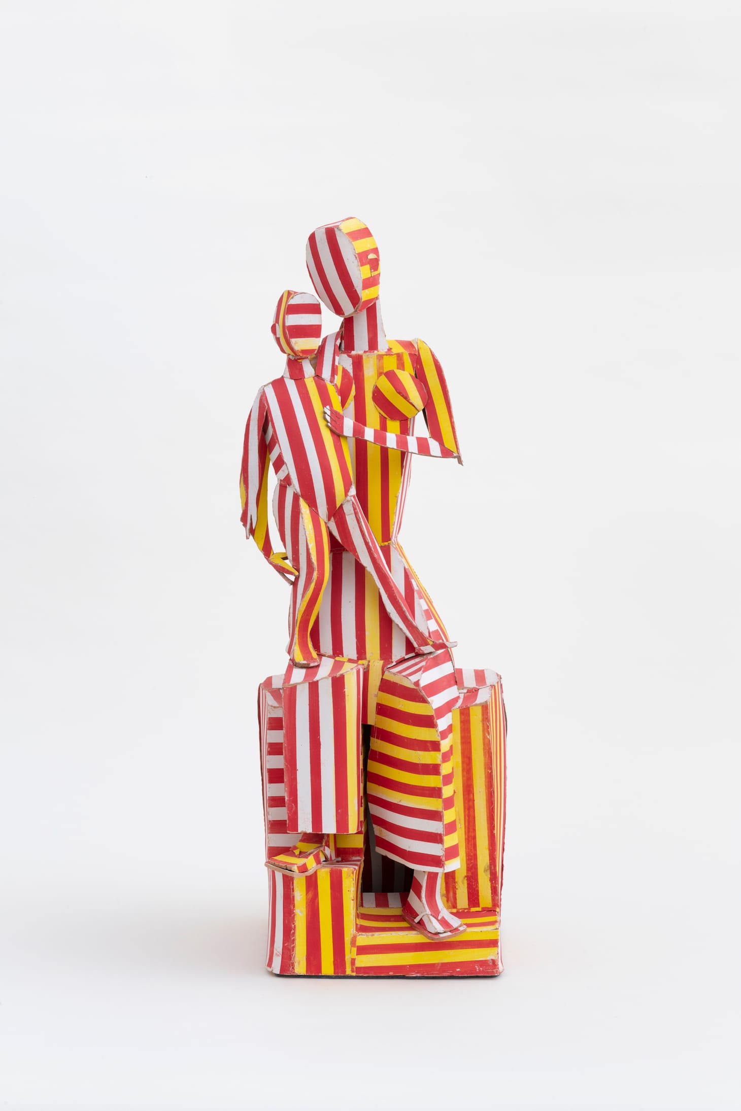 Their dynamism is as much a result of chroma, however, as it is of underlying form. Agee has deployed a wealth of sometimes unconventional techniques to color her figures, incorporating pigment evenly in raw clay; marbling slabs that she rolls out and slices; screenprinting, taping, spraying, and otherwise stenciling glazes; and, of course, directly china-painting, to create the brilliant range of patterns and hues that give these sculptures such unique life. Long influenced by 18th-century German and Italian porcelains of commedia dell’arte performers, she has never shied away from the polychromy that was anathema to modernist sculptural aesthetics. Here, she has stepped up her game, infusing the work with a degree of gravitas that obtains in medieval devotional figures. Indeed, some of the Madonnas are perched on bases with tiny drawers, a reference to the reliquary function that much medieval statuary performed.