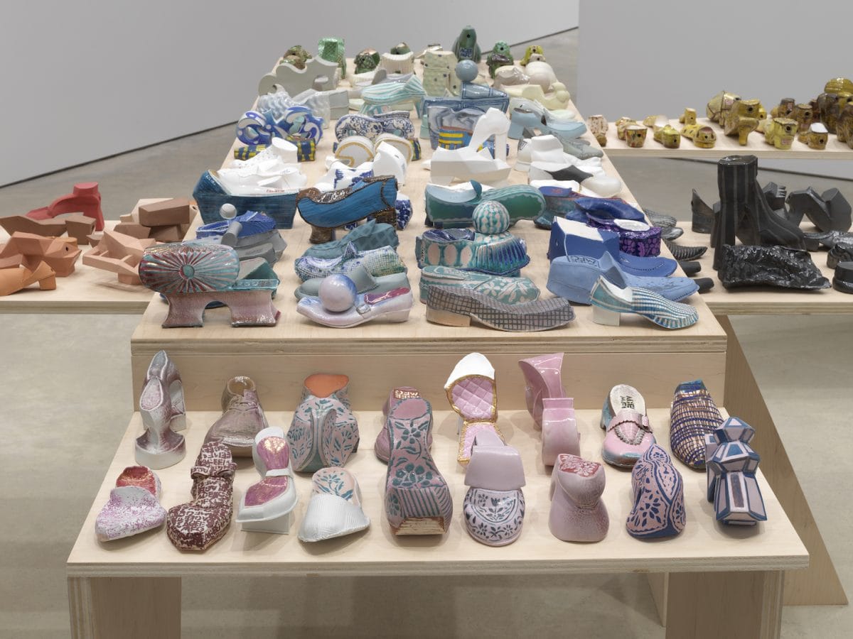 For her first show at PPOW since 2015, Madonnas and Hand Warmers, Ann Agee has produced a bounty of polychrome ceramics that vividly telegraph her wit and inventiveness. In the front gallery, on a room-size platform, are 66 Madonna sculptures, most with infant or child in tow, ranging in size from just under eight inches to three feet tall, all made during the past two years; in the front window, at four feet, is the largest Madonna, wearing gaily patterned bell-bottom slacks and a tank top, with the fitting title “Exquisitely Dressed Madonna” (2021). In the gallery’s back room are dozens of shoe-shaped sculptures that compose an ongoing series Agee calls her Hand Warmers. Each Madonna or shoe is stamped with the artist’s mark, AGEE MFG, referring to her years’-long enterprise of making works in many mediums — from wallpaper to clothes, books, bathroom tiles, and even marmalade — that blur the lines between domestic life, artistic production, and social connectivity.