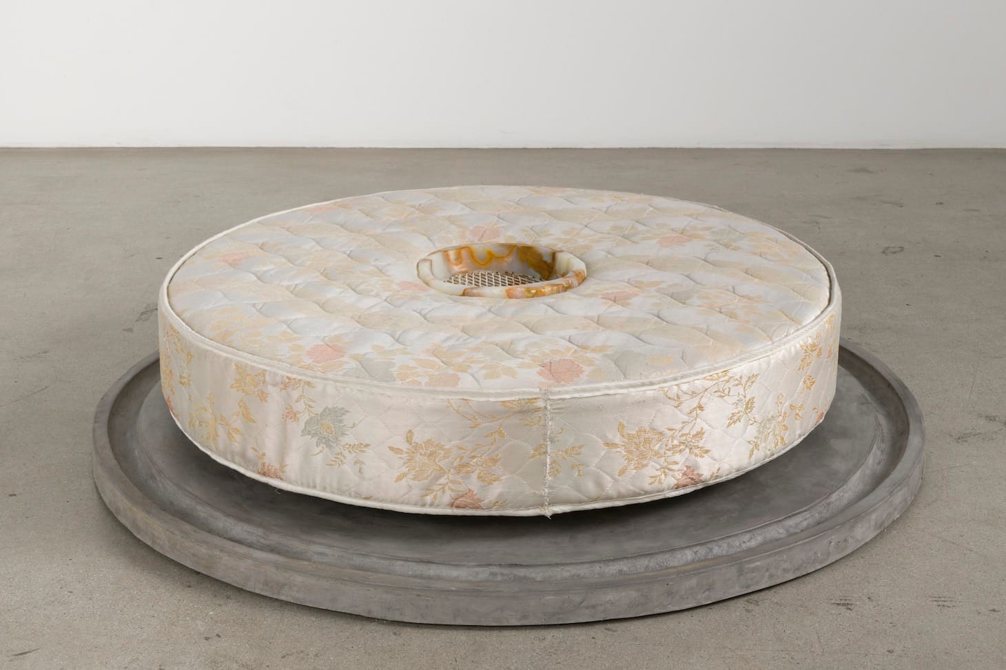 The drain is one of Kelly’s recurring motifs. It initiates a dialogue with Gober’s psychologically loaded works, but Kelly’s drains are more mysterious than disquieting, and double as material reminders of the interplay between positive and negative space in sculpture. “Untitled” (2019), included in the ICA show and last year’s Michael Benevento show, is comprised of a round mattress (which Kelly customized from a standard rectangular one) atop a round plaster slab with a groove around its edge. An onyx fountain drain covered in wire mesh is embedded in the center of the mattress. The contrasting textures (hard, soft, slick, metallic) are complemented by the repetition of the circle. Formally, the sculpture emphasizes how discrete elements form a whole not simply through agreement, but also through tension.