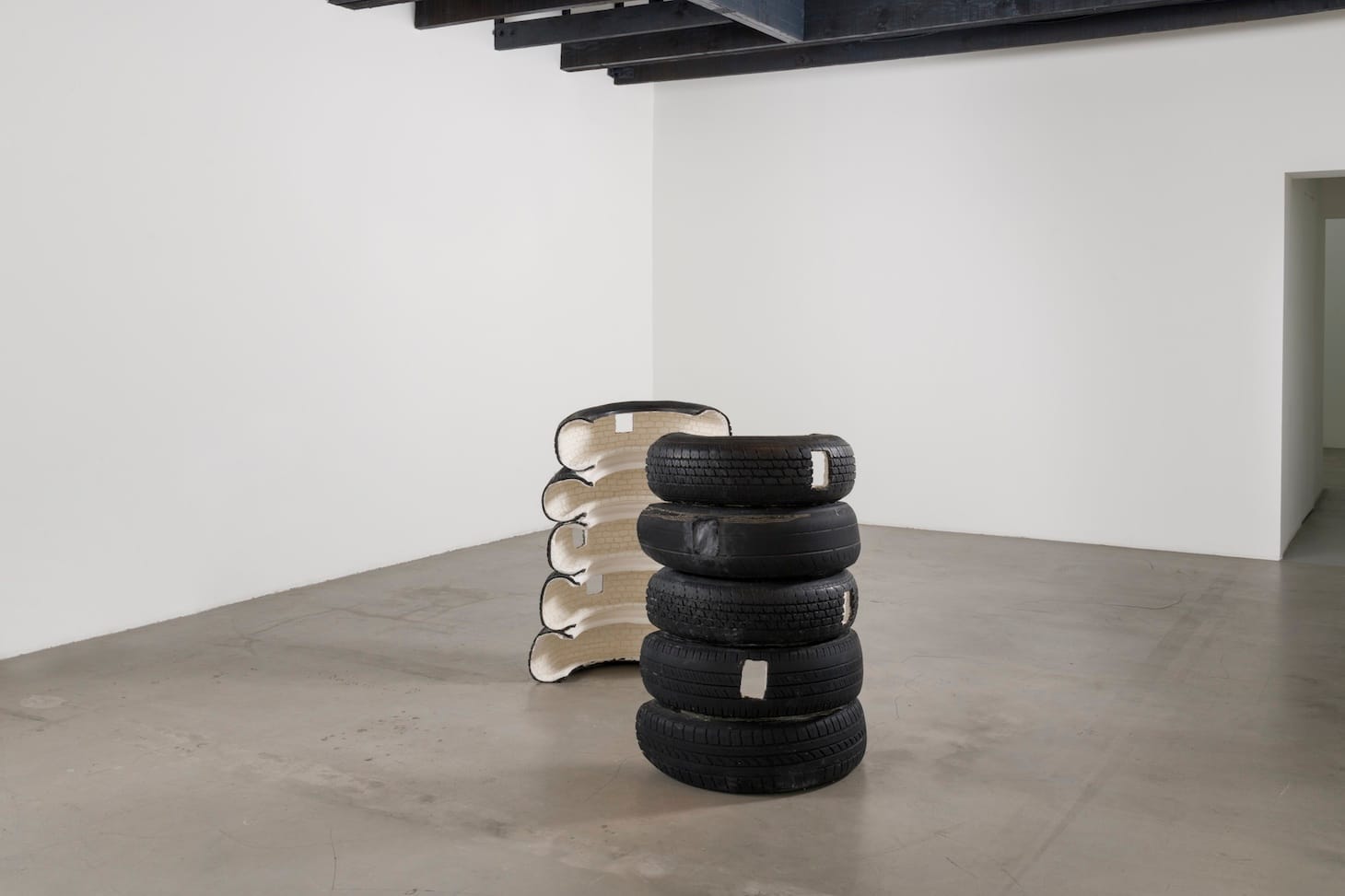 A series of sculptures composed of stacked bisected tires are more overtly narrative than the mattress works, but they share the former’s layering of formal and social relations. White plaster, carved to resemble a tiled wall, coats the interiors of two tire stacks facing each other in an untitled work the artist made in 2019; with their window-like cutouts, the stacks allude to apartment buildings. Kelly wryly transforms junkyard objects into a miniature “home” whose exterior makes the illusionism all too clear. (For another untitled stacked-tire sculpture from 2020, made for the ICA show, fabric stiffened with plaster cascades down a single stack of tire halves, removing the interior from public view.)
