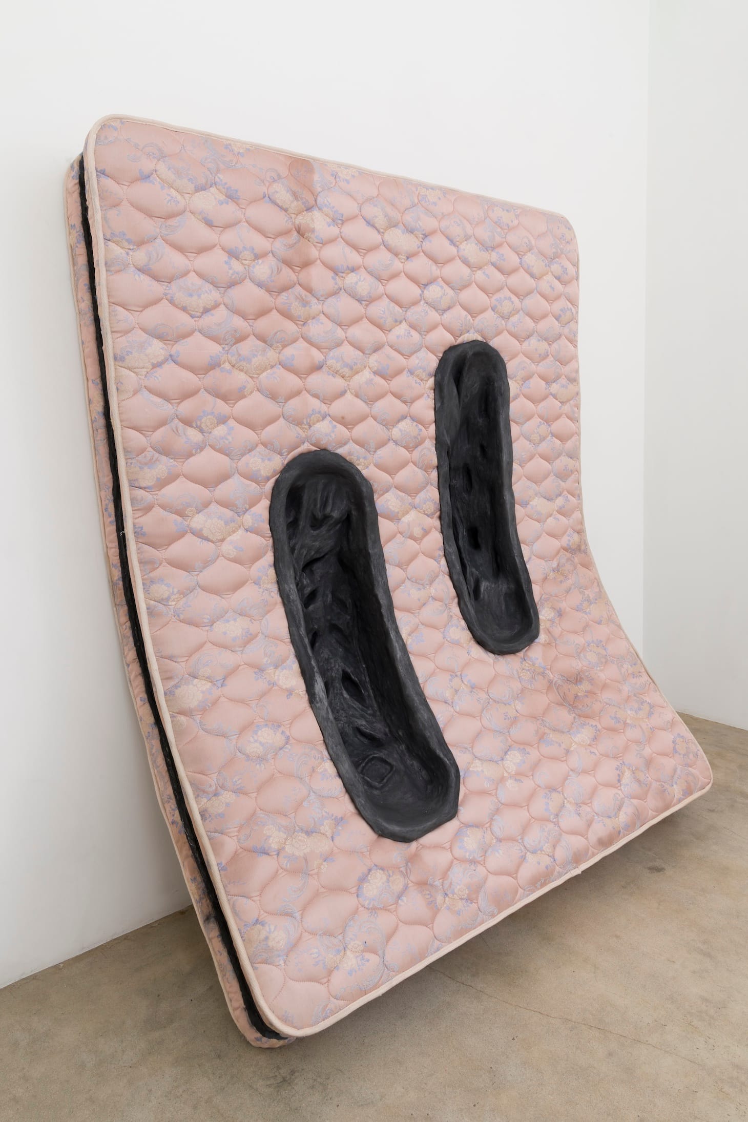 Kelly’s sculptures slip between formal and symbolic registers, in a perpetual state of becoming Other. In this way they suggest not just the human body, but the complexity of the human subject. For another untitled 2019 work, she carved two black tire grooves into a queen-sized pink mattress. The sculpture’s scale and orientation — slumped against the wall in her Michael Benevento show — mimicked Minimalist monoliths, but the object’s slackness and wear-and-tear traded Minimalism’s impermeable forms for something more porous and vulnerable.